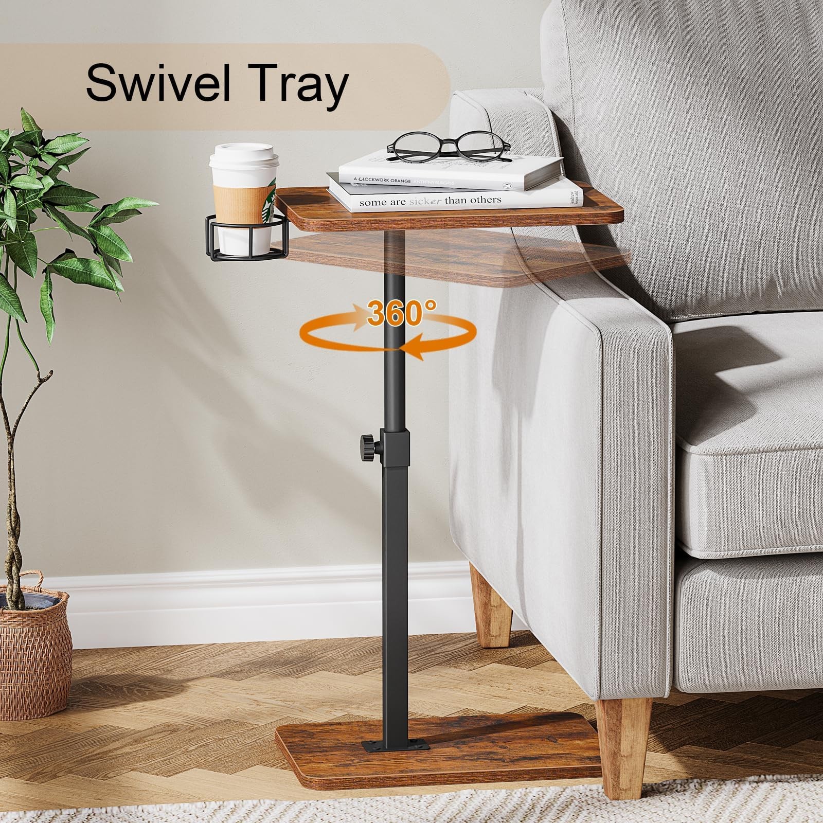 Product Description TV tray combines sleek design with functionality. It features 2 wooden panels, with the top panel capable of 360-degree rotation. Each panel measures 15.8 inches x 10.6 inches and is supported by a robust metal tube. The height of tv tray table is adjustable, ranging from 17.3 inches to 30 inches, and the overall C-shaped design enhances stability and durability. Specifications: 1. Color: Black and rustic brown 2. Material: Metal support tube and wood chipboard 3. Assembled Dimensions: 15.8"(Length) x 10.6""(Width) x 17.3"-30" (Height adjustable) Package Contents: 1x Height adjustable TV tray, 1xmanual Product Highlights: 1. 360° Rotating TV Trays: The wooden tabletop can rotate 360 degrees, making it perfect for placement beside sofa arm, bed, or lounge chair. 2. Height Adjustable Tray Tables: Easily adjust the height from 17.3 inches to 30 inches. 3. Multi-Scene Use: Ideal as tv trays for eating on couch, a sofa side table for watching TV, or an C-shape end table for working or relaxing. 4. Sturdy Structure: The base features a thickened wooden panel, ensuring stability and minimizing wobbling. 【Space-Saving Design】adjustable TV tray is perfect for tight space, seamlessly fitting beside sofa, recliner, or bed without taking up much room. The tabletop measures 10.6" x 15.8", ideal for holding snacks, drinks, or a laptop, providing easy access to your items while relax. 【Swivel & Height-Adjustable TV Tray】TV tray table features a 360° swivel tabletop and an adjustable height ranging from 17.3" to 30". Whether you're dining, working, or relaxing, you can easily adjust the height and position of the tray table to meet your needs, ensuring maximum comfort and convenience. 【Versatile TV Tray table】This height adjustable and 360° swivel side table seamlessly complements any home decor. It can function as a tv dinner table for snacks and drinks, a sofa armrest side table for living room, a tray table for bedroom, or anywhere you need a convenient surface. 【Easy To Assemble】The TV trays feature a simple structure and can be assembled in just a few minutes with basic steps. It's suitable for both adults and kids, making it a practical gift for housewarmings, birthdays, or back-to-school gift. 【Stable and Easy to Clean】 The C-shaped design, along with a metal support tube and reinforced base, ensures stability and durability. The tabletop is crafted from premium chipboard, providing a smooth, heat-resistant, and waterproof surface that's easy to clean. Unique rounded corners enhance practicality and safety.