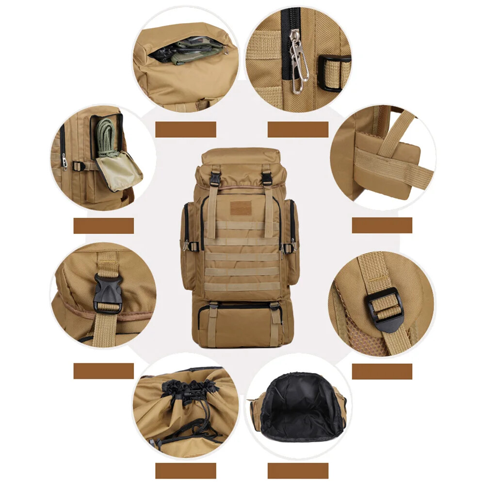 Features: This hiking backpack has a large main pocket, a top zipper pocket, a bottom zipper pocket, two side zipper pockets, front zipper pocket. Its breathable back panel features airflow channels, ensuring optimal ventilation and comfort, even when fully loaded. The adjustable padded mesh shoulder straps are designed to alleviate shoulder stress. The adjustable chest strap and waist straps ensure a custom fit for all users. This backpack is the ideal companion for a variety of outdoor activities, including Cycle, camping, hiking, and mountain climbing. Specifications: Material: Canvas Color: Black/ Khaki/ Army Green/ Camouflage 1/ Camouflage 2/ Camouflage 3/ Camouflage 4 (optional) Size: 65*35*18cm/ 25.6*13.8*7.1in Weight: 1kg/ 2.2lbs Package list: 1 * backpack
