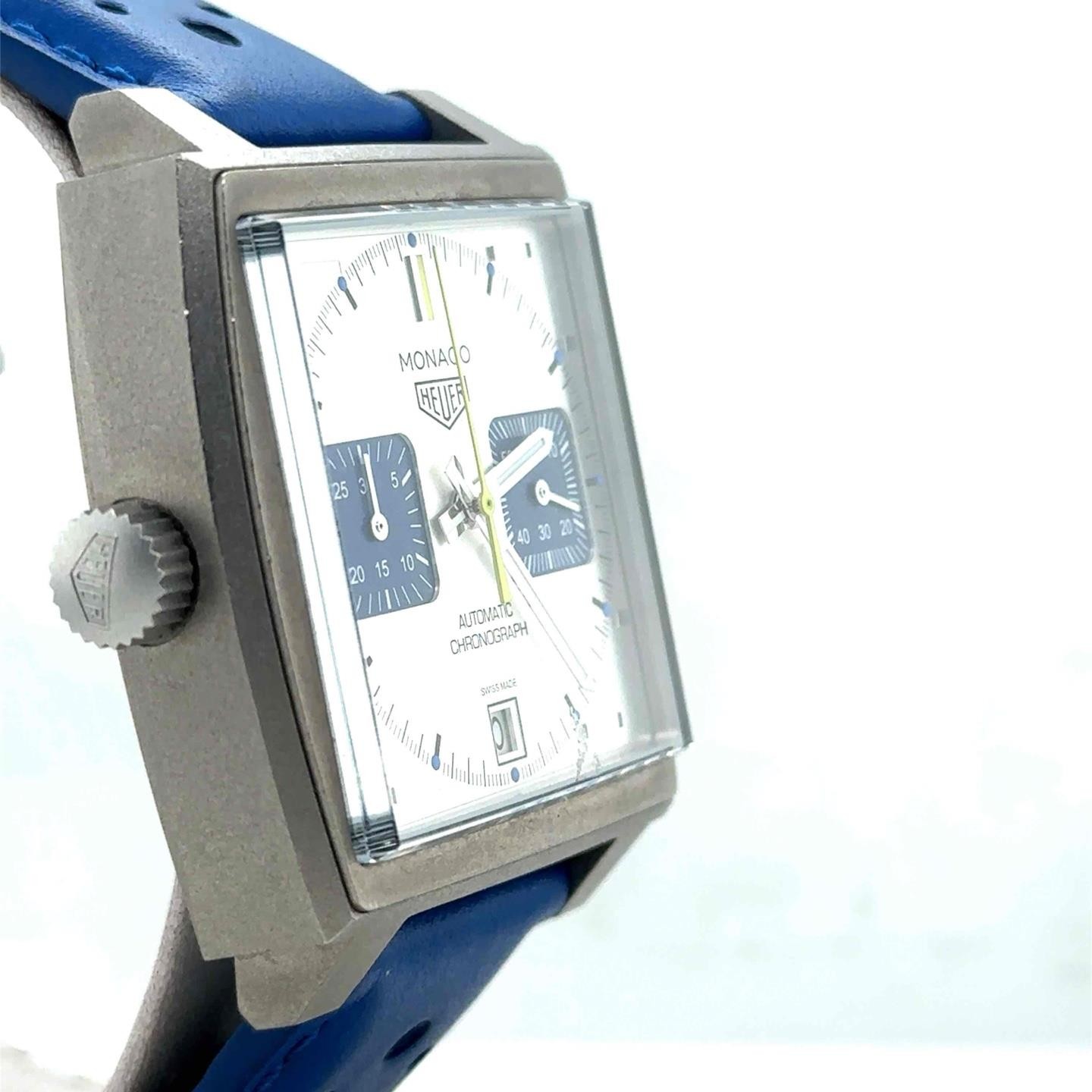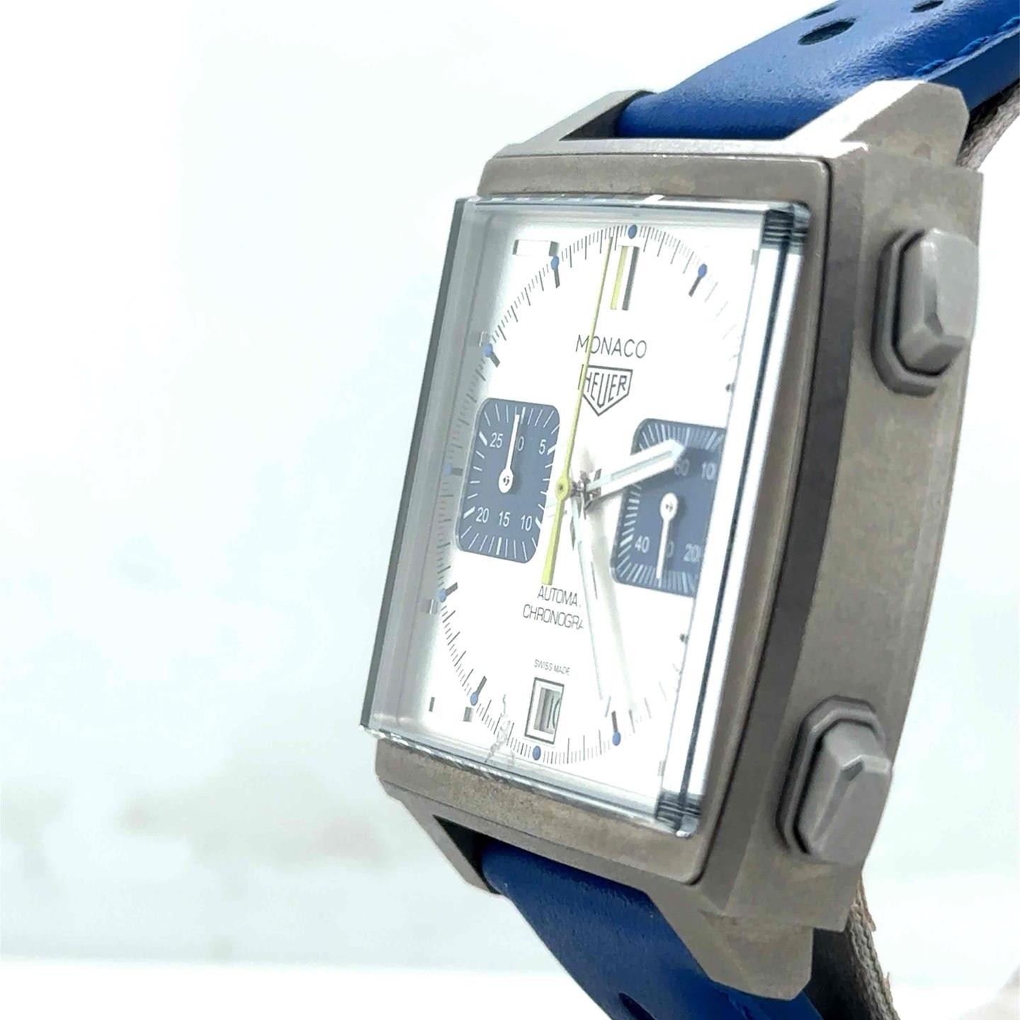 Style: Luxury Movement: Mechanical (Automatic) Band Material: Leather Caseback: Solid Model: TAG Heuer Monaco Closure: Push-Button Deployant With Service Records: No Watch Shape: Square Dial Color: Silver Case Material: Titanium Country/Region of Manufacture: Switzerland Type: Wristwatch Display: Analog Water Resistance: 100 m (10 ATM) Band Color: Blue Brand: TAG Heuer With Manual/Booklet: No Band/Strap: Two-Piece Strap Case Thickness: 14 mm Department: Men With Papers: No Case Size: 39 mm Bezel Color: Gray With Original Box/Packaging: No Seller Notes: “Pre-owned” Case Finish: Sandblasted Customized: No Vintage: No Reference Number: CAW218C.FC6548 Bezel Type: Fixed Case Color: Gray Features: 12-Hour Dial, Chronograph, Date Indicator, Fixed Bezel, Luminous Indexes, Push/Pull Crown, Sapphire Crystal, Scratch-Resistant, Seconds Hand, Self-Winding, Small Second, Swiss Made, Swiss Movement, Water-Resistant Band Width: 20 mm Indices: Stick Indexes