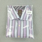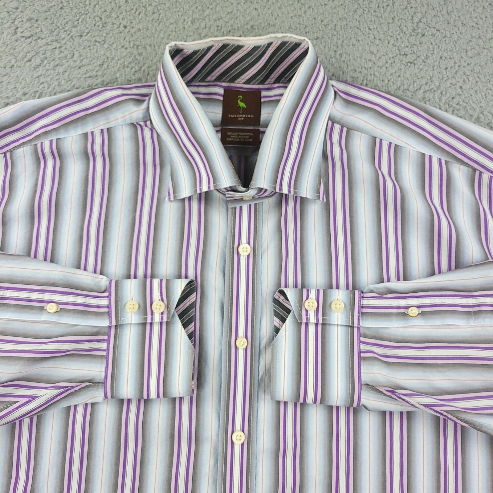 Tailorbyrd Dress Shirt Mens 3XLT Purple Stripe Cotton Long Sleeve Contrast Cuff Brand: Tailorbyrd Style: Mens long sleeve dress shirt with spread collar, button front placket, and big & tall silhouette. Color: Light blue, gray, white, and purple vertical stripe pattern with contrasting diagonal stripe trim at inner collar and cuffs. Size on tag: Mens 3XLT Material: 100% cotton woven fabric. Made in China. Features: Big and tall sizing for extra body and sleeve length, spread collar suitable for business or casual wear, barrel cuffs with contrast lining, breathable cotton construction ideal for office, dress, or smart casual occasions. Measurements are included in the photos, compare measurements with your item to ensure proper fit. Items are added daily click here to Visit My Store Combined shipping for US customers is 1.99 for each additional item Items are cleaned per eBay standards & policies