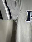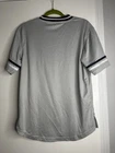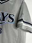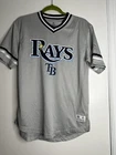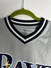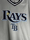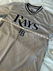 Tampa Bay Rays Jersey Shirt Grey V Neck. True Fan. Medium. Short Sleeve. Logo. Contrasting collar and sleeve cuffs. Excellent used condition. No rips, stains or defects. Please see pictures for measurements.