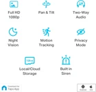 About this item 【Up, Down, All Around】This Pan/Tilt IP camera see everything across an entire room or walkway with the 360° horizontal and 114° vertical range pan/tilt field of view. 【Detection & Instant Notification】Get instant push notifications when motion, person or baby crying is detected, there is no additional fee to use it as a baby camera monitor. Discern from notifications that matter, so you'll know if someone is there. 【2-Way Audio w/ Built In Siren】Never truly leave home with the built-in 2-way audio. Use as a pet camera with phone app to comfort your pet from anywhere in the world. Keep your family safe with cameras for home security indoor by warding off intruders. 【Secure Local or Cloud Storage】Save footage continuously on up to a 128 GB microSD card (not included) or subscribe to Tapo Care for cloud storage which saves 30-day video history and provides additional benefits such as motion tracking and more. 【Night Vision up to 30 Ft.】Never miss a thing that goes on, even at night thanks to the integrated IR system on this indoor camera which provides 30 feet of night vision. 【1080P Full HD】Capture every detail inside your home with crystal-clear 1080P Full HD video with this indoor security camera. Easily see what your baby is holding or what your pet is playing with. 【Device Sharing】View your WiFi camera feed from two different smart phone devices. Now mom and dad can both see what's happening at home with a single camera, making keeping an eye on the little ones just a bit easier.