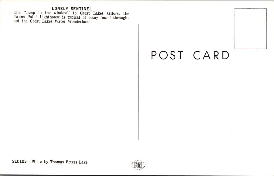 Vibrant postcard featuring the Tawas Point Lighthouse, a critical beacon for Great Lakes sailors. This chrome-era card by Sun Photos captures the striking contrast of the white tower and red-roofed buildings—an iconic Michigan lakeside image.