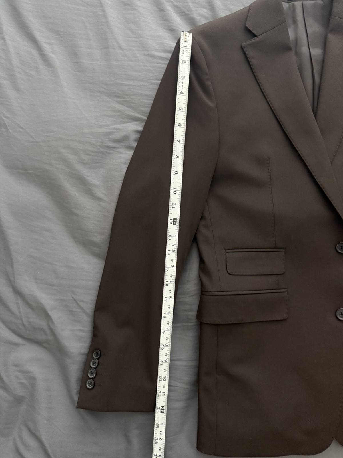 The Tayion Men’s Brown Full Suit includes a blazer in size 38R and pants in size 32x30. It is made from a polyester blend material and features a classic two-button single-breasted front, straight leg style, and double-vented back. The suit is designed for all seasons with a regular fit and a timeless classic theme. Made by the brand Tayion in China, this two-piece suit is perfect for any formal or professional occasion.