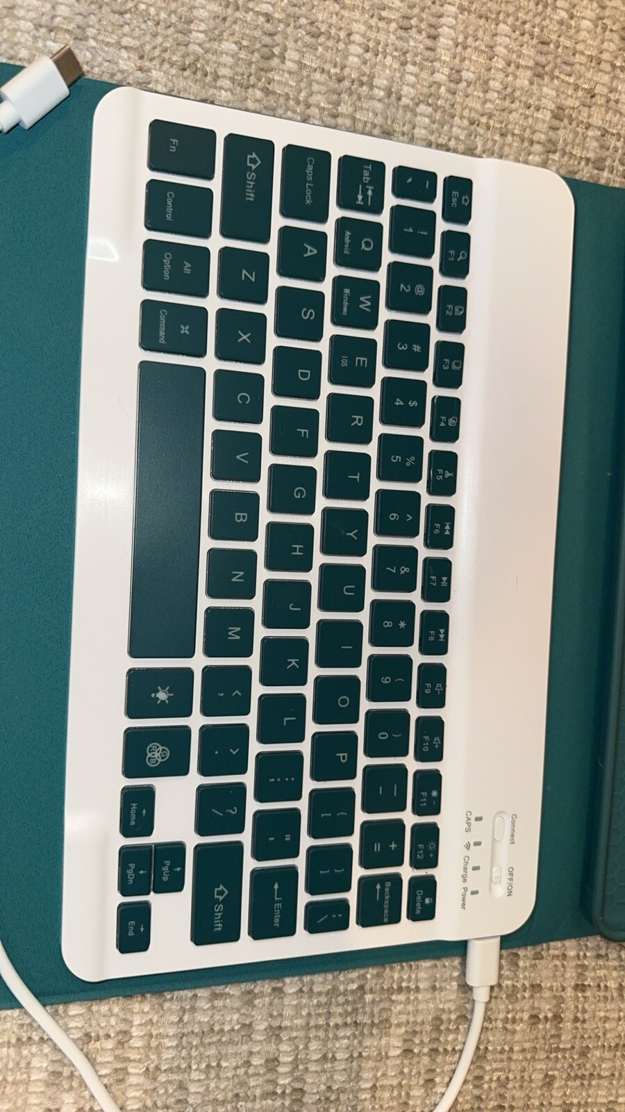 iPad keyboard and case. Keyboard magnetically attaches to case and connects to iPad via Bluetooth. Has an Apple Pencil storage slot. Case in good condition with little to no signs of wear. Comes with charging cord for usb-c block (block not included). Keyboard works with no issues
