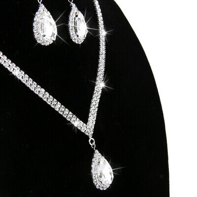 Store Home | Home & Garden | eBay Motors | Business & Industrial | Computers/Tablets & Networking | Consumer Electronics | Crafts | Pet Supplies | Clothing, Shoes & Accessories | Cell Phones & Accessories | Jewelry & Watches Teardrop Rhinestone Jewelry Necklace Earring Set Wedding Party Costume Description : Beautiful and elegant , diamante necklace with matching earrings This delicate jewelry set used high quality sparkling rhinestones , brings you gorgeous and charming Ideal for wedding , banquets , prom or any other special occasions Specification : Material : Alloy , rhinestone Color : Silver Necklace length : Approx 37 - 53cm / 14 . 6 - 20 . 8 inch ( adjustable ) Earring length : Approx 4 . 5cm / 1 . 77 inch Earring style : Piercing Package Includes : 1 Piece Necklace 1 Pair of earrings Note : Since the size above is measured by hand , the size of the actual item you received could be slightly different from the size above . Meanwhile , please be reminded that due to lighting effects , monitor 39 ; s brightness / contrast settings etc , there could be some slight differences in the color tone of the pictures and the actual item . Shipping And Handling Policy People always bought together with