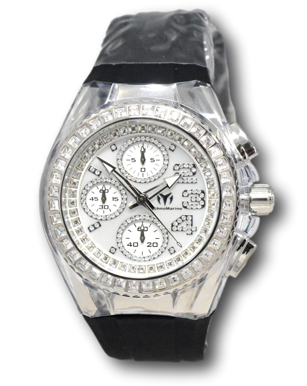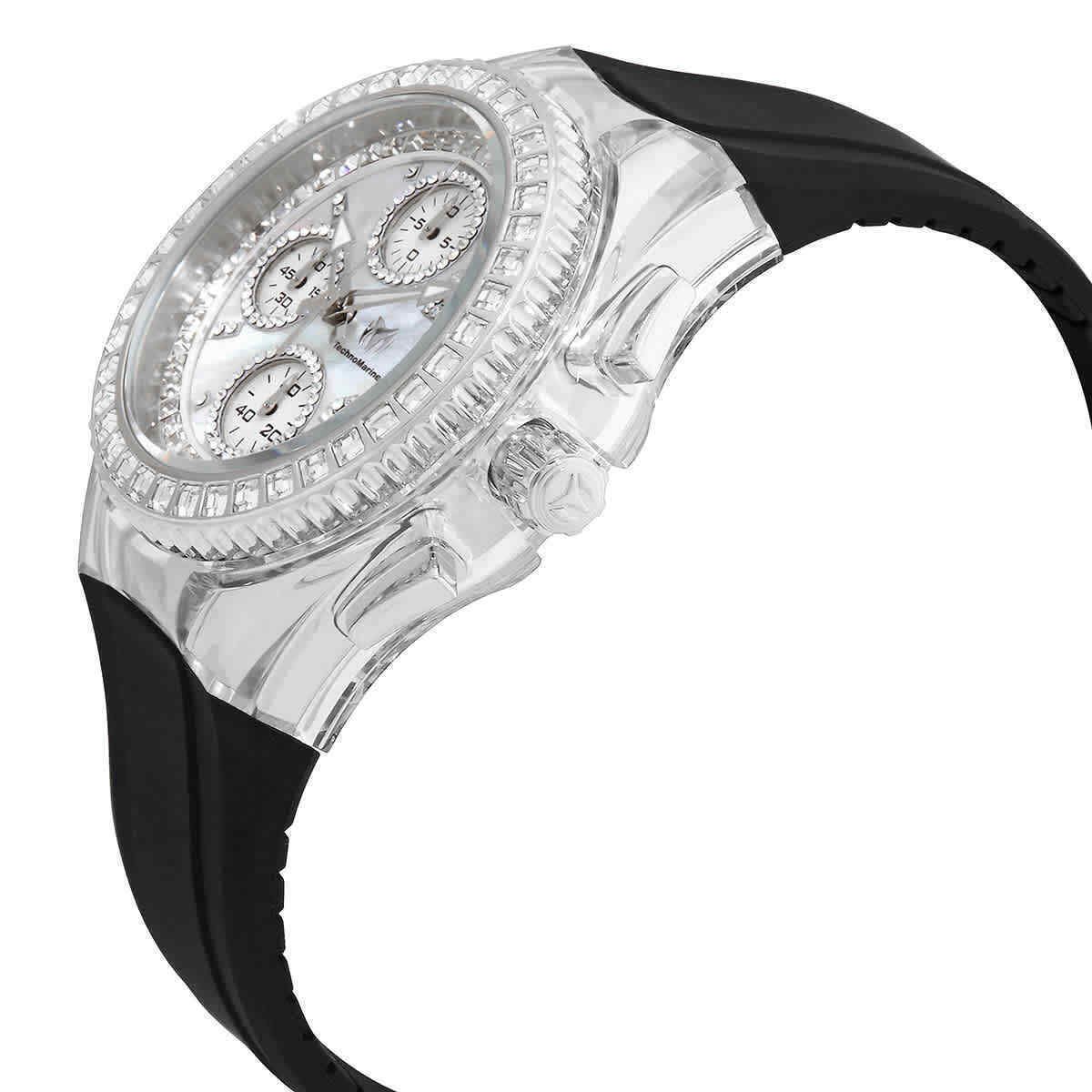 Reference Number: TM-121055 Features: 12-Hour Dial, Chronograph, Gemmed, LED Display, Luminous Hands, Scratch-Resistant, Seconds Hand, Splash Proof, Water-Resistant Movement: Quartz Bezel Type: Fixed, Gem-Set Style: Casual, Classic, Dress/Formal, Luxury, Sport Band Material: Silicone Dial Color: Multicolor, Silver, White Case Color: Clear, Silver Bezel Color: Silver, White Customized: No Model: TechnoMarine Cruise Glitz Type: Wristwatch Department: Women Caseback: Screwback Case Finish: Gloss With Original Box/Packaging: Yes Brand: TechnoMarine Case Material: Plastic, Stainless Steel With Papers: Yes Band Width: 19 mm Indices: Arabic Numerals, Square Indexes, Stick Indexes, 12-Hour Dial, Multiple Hands, Non-Numeric Hour Marks, Seconds Hand Watch Shape: Round gtin13: 886678466481 Band/Strap: Bracelet/Link Band Case Size: 40 mm Water Resistance: 200 m (20 ATM) Band Color: Black Max Wrist Size: 7.1-7.25 in Year Manufactured: 2020-Now Display: Analog UPC: 886678466481