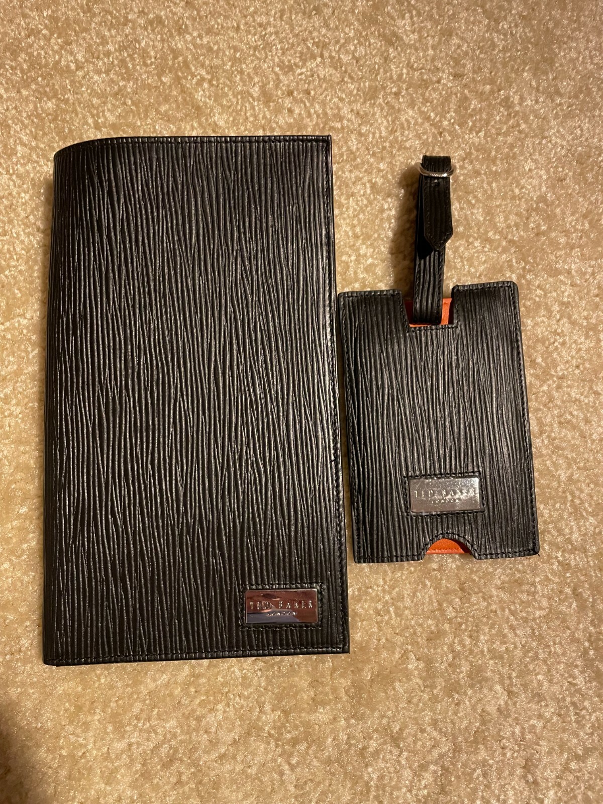 Ted Baker Woodgrain Leather Passport Holder Luggage Tag Set Black This travel set by Ted Baker is perfect for your next vacation. • Passport holder and luggage tag • Embossed monogram branding • Silver foil logo details • Presented in a branded box • 100% Polyurethane • Passport holder dimensions: H:8.25” x W: 5” • Luggage tag dimensions: H: 4.75” x W: 3” 7490