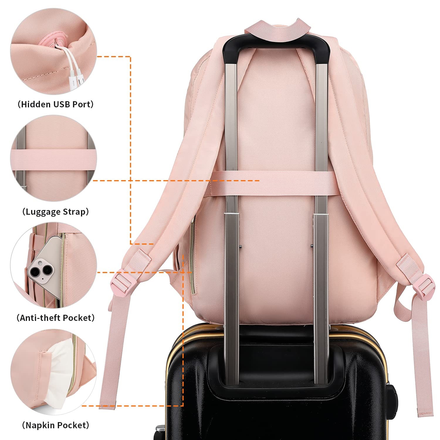 【NEW RELEASE IN STYLE】 18"x12"x9.06" (HxLxW). Weight only 1.4 lb. This women backpack is designed with exquisite gold-plated zippers and stylish twill nylon exterior material. The luster of cloth and metal complement each other, perfectly serve as a laptop carrying bag, bookbag, bagpack and knapsack for women. 【LARGE CAPACITY - MULTI-POCKETS】 With plenty of pockets, this bookbag could organize all your supplies well. The front pocket for your pens or books; The main compartment have enough space for A4 folder, magazines, clothes or Kindle; With a fully padded independent laptop compartment for max. 15.6 inch laptop, Notebook or your Ipad. Sided pockets for your water bottle or umbrella. And special design with keychain and napkin pocket. 【USB CHARGER PORT - TSA APPROVED】As a laptop backpack ,a built-in hidden USB port is convenient to charge your smartphone or put through your earphone to listen music freely while walking or cycling. And unfolding the travel backpack freely 90-180 degrees makes you quickly through the airport security and keep items tidy, which is exclusively designed for airplane travel. 【ANTI-THEFT POCKET – LUGGAGE STRAP】 Back hidden pocket keep your valuables safe and handy and it's difficult to steal your valuables without you feeling it. The luggage strap is very practical for you to attach the laptop bag on the trolley of your luggage to make your trip more comfortable. 【PRACTICAL】 The ergonomic breathable shoulder straps relieve the strain on the shoulders even when carrying it for a long time. Suitable for many occasions such as sports, travel, work, college. It is also the perfect gift for women, family, friends in your life.(Age: over 3 years old)