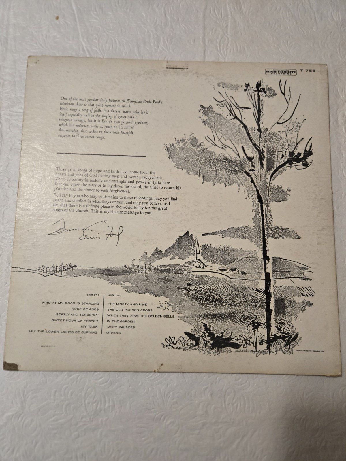 The product is a vinyl LP record of "Hymns" by Tennessee Ernie Ford, released by Capitol Records in 1962. The record is a 33 RPM black vinyl in a cardboard sleeve, with a high-fidelity mono audio channel. This first pressing LP features gospel and Christian music, showcasing the artist's vocals in a very good plus (VG+) condition. The album includes original cover art and is a collectible piece for fans of vintage gospel music. The cardboard sleeve is showing some wear from being 60 plus years old. A vinyl sleeve encases this LP record to enhance and protect the beauty and quality of this album.