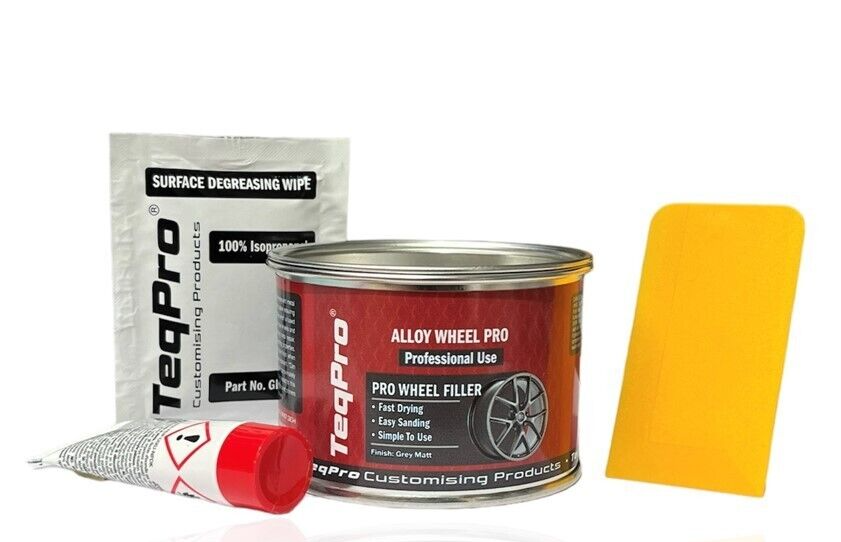 Free eBay listing template designed by dewiso.com Description . TeqPro ® Professional Wheel Paints are superfast drying refinishing paints which have been formulated for the customisation or refurbishment of alloy wheels. The advanced acrylic formula protects against weathering and yellowing and is UV and chip resistant. It is recommended to use TeqPro ® EP400 High Build Etch Primer as the undercoat on any bare metal or partially abraded old coatings. For a sealed weatherproof finish use either TeqPro ® HGC400 High Gloss Clear Coat or TeqPro ® MCC400 Matt Effect Clear Coat, depending on your preference. Instructions for use Ensure to shake spray cans for 3 minutes before application. Alloy Wheel Pro Filler 250g Information and Instructions for use. TeqPro Alloy Wheel Pro Filler is a special 2 Component filler which is fused with alluminium Particles to facilitate vibration resistant repairs to metal, alloy car wheels and other metal surfaces. Aluminium particles in the filler fuse together to form a very strong metal repair and provide maximum adhesion. It is very easy to obtain a fine sanded finish for the primer application. Superfast drying and easy to sand High Strength Repairs Vibration Resistant Can be used in the powder coating process and will withstand 180 C for approximately 20 mins. Note: In any powdercoating applications, the filler itself should be be heated to this temperature until it has fully cured itself. AWP250 is a grey aluminium colour, meaning that coloured primers can easily cover and hide the filler when preparing for the paint application. Size: 250g by weight. Includes 8g Hardener and Red Micro filler Spreader. Warning : Never attempt to repair a split alloy wheel using filler. Always seek specialist advice if you are unsure. This Kit Includes: 3 x WRX Gold Metallic 400ml Spray Cans + 1 x Matt Effect Clear Coat 400ml Spray Can + 1 x Alloy Wheel Pro Filler 250g including 8g Hardener and 1 x Yellow Micro Filler Spreader. Features and further details High Quality WRX Gold Metallic Kit (Matt) Adjustable Pro Fan Spray Nozzles Acrylic Coating for Superior Adhesion Chip and Scratch Resistant Superfast Drying. UV Resistant. This Alloy Wheel Paint Kit Includes: 3 x WRX Gold Metallic 400ml Spray Cans. 1 x Matt Effect Clear Coat 400ml Spray Can. (MCC400) 4 x TeqPro ® 100% isopropyl Surface Degreasing Wipes. 1 x TeqPro ® Alloy Wheel Pro Filler 250g with 8g Hardener and Yellow Micro Filler Spreader. Contact us We can be contacted through eBay messages if you have any questions, comments or specific requests. We will aim to respond to you within 24 hours and do our best to help you out! We encourage our customers to contact us with any questions. Payment Standard payment by PayPal or Debit / Credit Card is accepted. . Shipping We aim to ship orders on a daily basis. Our cut off for shipping is 2 pm. each day. eBay will notify you when we have successfully dispatched your order and the courier company will update you with the relevant tracking information. Disclaimer Whilst we have made every effort to make the colours and finishes on screen as close as possible to the colours and finishes of the products you'll use, the representation of colours, gloss levels, metallic effects and textures are limited by technology and may vary due to your screen resolution, device and or printer settings. Therefore do not rely on the colour image for accuracy and do not attempt to match this colour with any manufacturers colour code or colour name. Listing template copyright TeqPro Ltd. 2023.