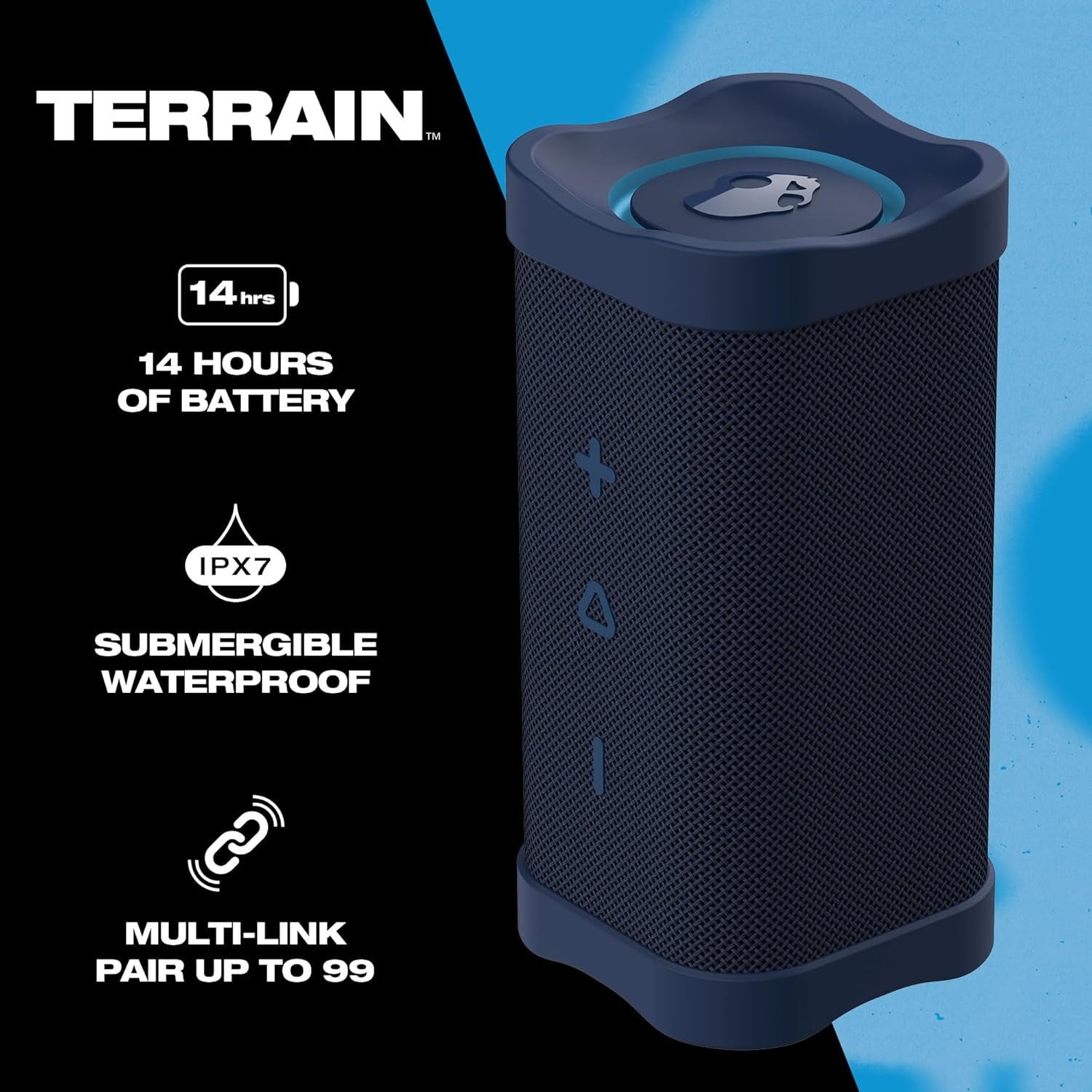 On-the-go audio. Bring big, beautiful sound wherever you go — Terrain is built to handle whatever Mother Nature dishes out. Link two Terrain speakers wirelessly to listen in full stereo or connect up to 99 Skullcandy Multi-Link-enabled speakers to entertain any crowd from 1 to 1000. Worry-free wireless. With impact-resistant construction and an IPX7 waterproof rating, Terrain can take a beating. And with 14 hours of play time, Terrain won’t end the party with an awkward silence. Plenty loud for any crowd. Terrain can wirelessly connect with up to 99 Skullcandy Multi-Link-enabled speakers with a simple press of a button. Just tell your friends to bring their Skullcandy Terrain Mini, Terrain or Terrain XL speakers and your sound system will grow with the guest list. IPX7 Waterproof Mini Bluetooth Speaker - Take our speaker to the beach or pool without worrying about damage- whether it’s a bonfire on the beach, a post-hike camp cooldown, or the pre-game tailgate, our adventure-ready small Bluetooth speaker is built to handle whatever Mother Nature dishes out. Powerful Bass Punch - Dual custom passive radiators create a powerful bass punch for a best-in-class wireless speakers experience. Portable & Durable- Skullcandy's mini wireless Bluetooth speaker comes with a nylon wrist wrap for easy carrying. The waterproof woven fabric mesh is engineered to allow maximum range of audio waves to pass through. Long Battery Life - Enjoy up to 14 hours of continuous playtime with the Terrain portable Bluetooth speaker. It also comes with a 3 ft C-to-A charging cable for easy charging on-the-go.