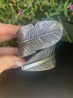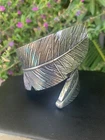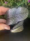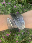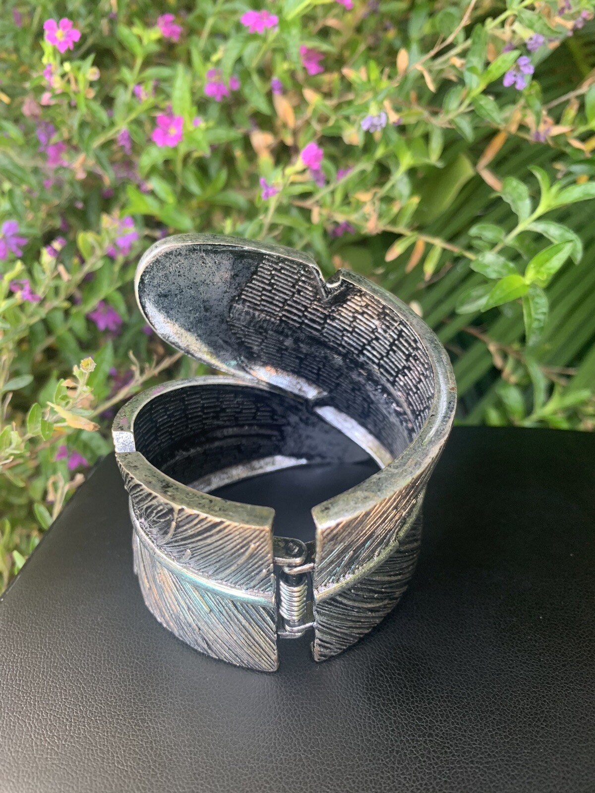 Add a touch of elegance to your outfit with this stunning cuff bangle bracelet. Crafted from textured metal, this silver-tone piece features a hinged design and a bypass clamper, making it easy to wear and adjust. Its feather shape and vintage style give it a unique charm, perfect for any occasion from Mother's Day to Graduation, Engagement to Birthday. This beauty is perfect for those who appreciate art, fashion, and costumes. Get your hands on this piece of jewelry now!