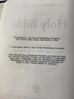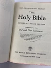 The product is "The Holy Bible RSV" Revised Standard version published by World Publishing in 1962. It is a leather-bound Bible with features such as color maps, concordance, family history dedication pages, and illustrations. The book is in English, intended for young adults and adults, focusing on topics like the Bible, Christianity, and Jesus Christ. It is part of the Holy Bible series with an edition including a concordance and is a vintage item from the 1960s.