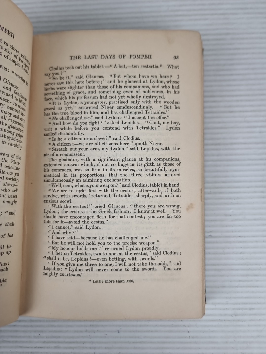Delve into the gripping historical novel "The Last Days of Pompeii" by Edward Bulwer-Lytton, presented in a scarce 1930 hardcover edition. This antiquarian collectable is a treasure for both literary enthusiasts and history buffs, offering a window into the final moments of the fateful Roman city with vivid storytelling that captures the imagination. A perfect addition to any bookshelf, this edition not only serves as a timeless piece of literature but also an emblem of the era's craftsmanship. With its original text in English, it stands as a testament to Bulwer-Lytton's enduring legacy and a celebration of classic narrative artistry. #12