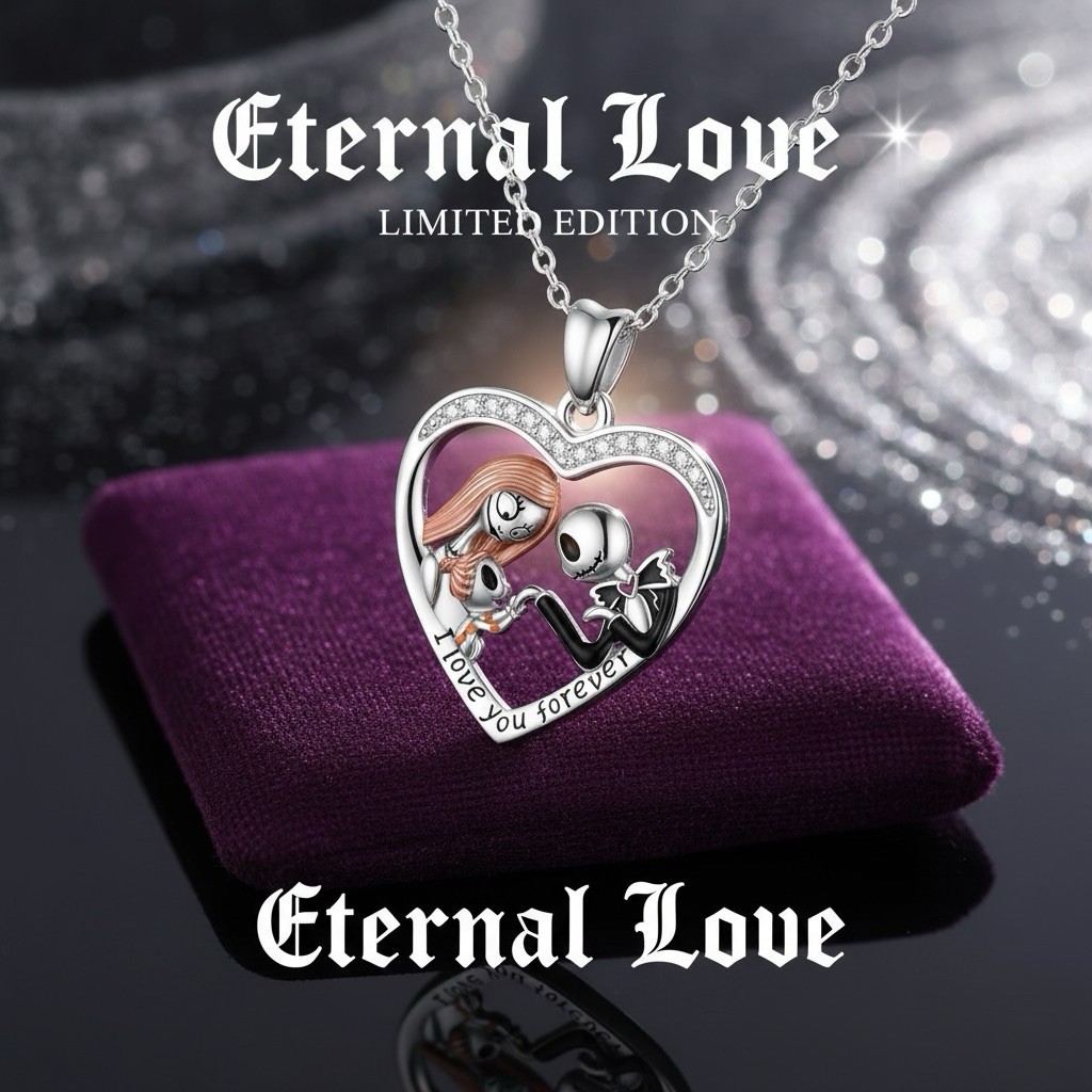 The Nightmare Before Christmas Jack & Sally I Love You Forever Heart Necklace is a charming pendant necklace inspired by the iconic characters from the beloved Halloween movie. The silver-plated necklace features a heart-shaped pendant with a clear main stone, symbolizing eternal love. This sexy and spooky necklace is perfect for fans of the movie and those looking for a unique and whimsical accessory to add to their collection. Made from stainless steel and metal alloy, this necklace showcases a bar link chain and lobster closure for a secure fit. Show off your love for these classic characters with this one-of-a-kind necklace.