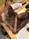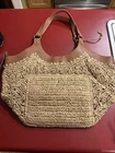 The Sak Roma Tan Woven Straw Hobo Bag is a stylish and medium-sized shoulder bag perfect for women who love a bohemian look. Crafted with woven straw and faux leather, this purse features a magnetic closure and brown/gold hardware accents. The interior is lined with a mix of polyester, canvas, cotton, and fabric in a beige color, providing both durability and a chic design. With a classic hobo bag style and brown faux leather handle/strap, this bag is both fashionable and practical for everyday use.