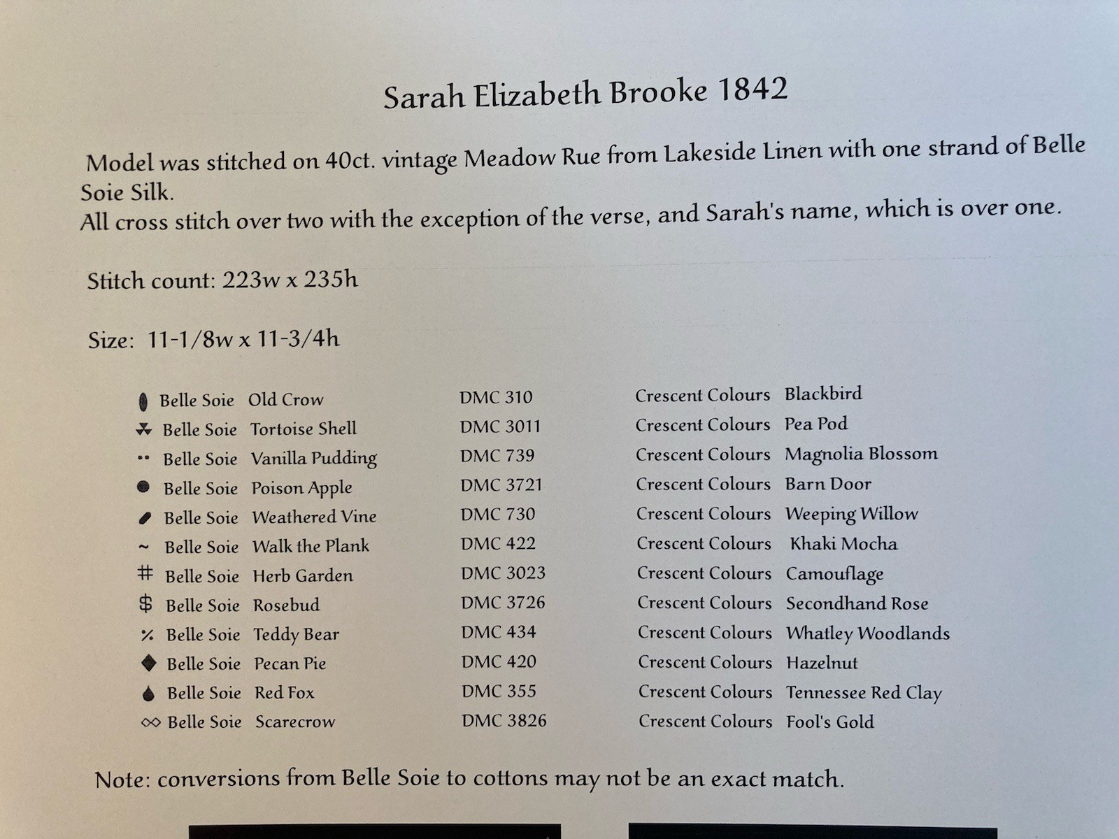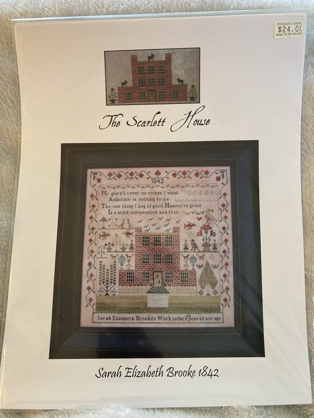 This beautiful sampler, originally designed by Sarah Elizabeth Brooke, was reproduced by Tanya Brockmeyer for The Scarlett House. Features a colorful floral border, home, birds, and the following inspirational quote: “No glory I covet no riches I want Ambition is nothing to me The one thing I beg of good Heaven to grant Is a mind independent and free” Stitched on 40 count vintage Meadow Rue from Lakeside Linens. Stitch Count: 223w x 235h Finished size on 40ct is approximately 11 1/8w x 11 3/4h inches. See photos for more details. Check out my other cross stitch items for sale. I will combine shipping. Please note my no return policy. Item is as described. Tracking included with shipping.