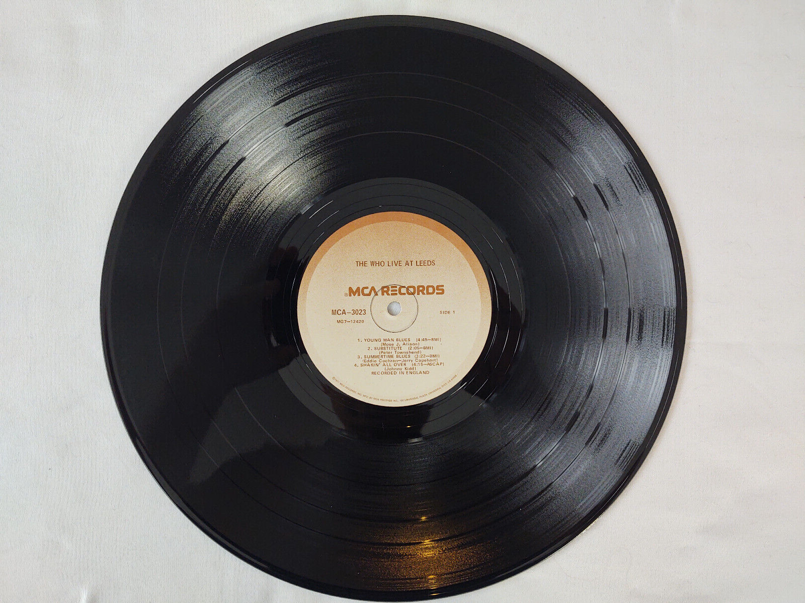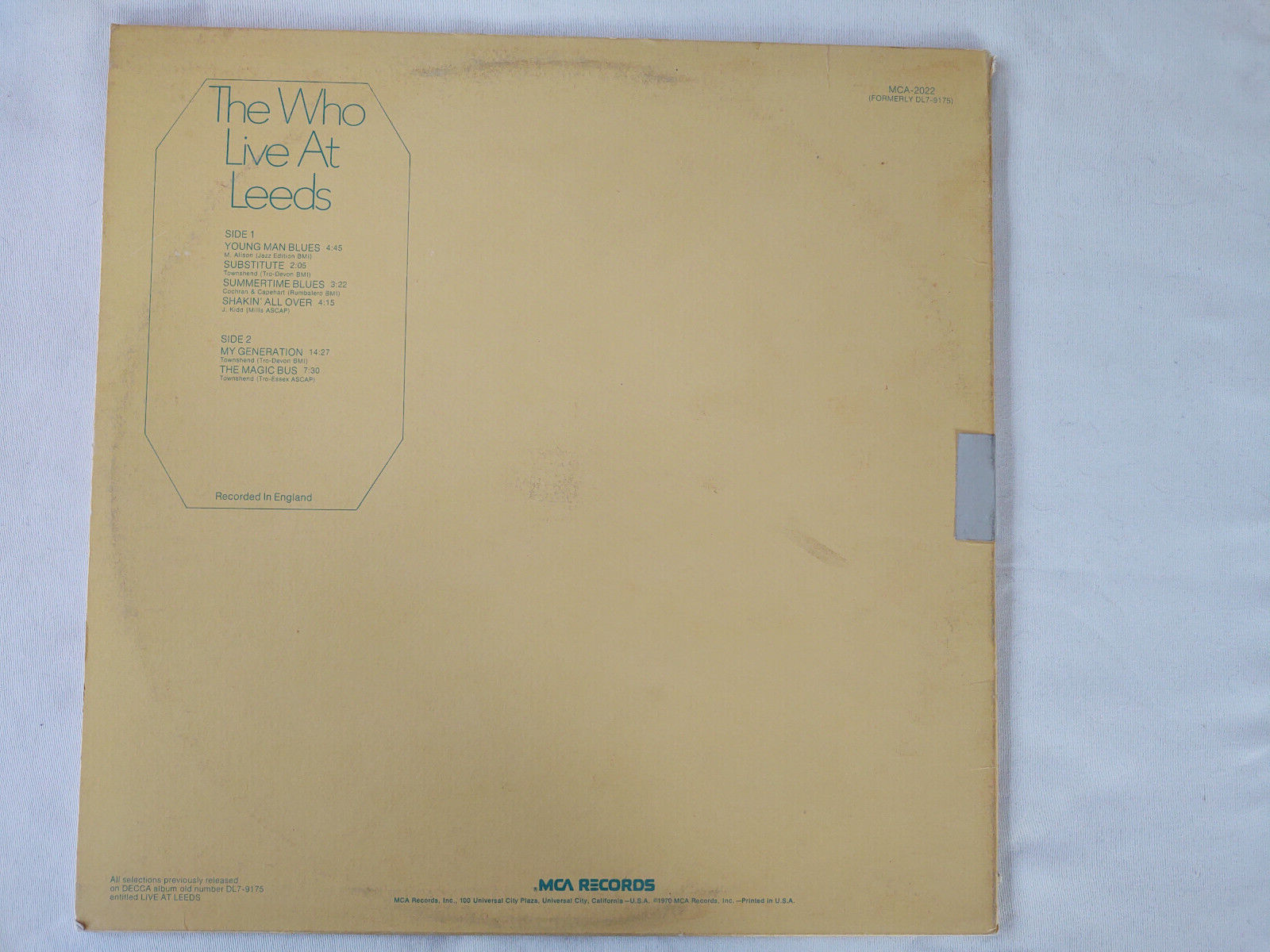 The Who's classic 1970 release "Live At Leeds". The LP is in VG+ condition; the original outer sleeve is in VG condition. The LP was ultrasonically cleaned and play tested prior to listing. Ships with rice paper-lined inner sleeve (in addition to original generic MCA sleeve) and protective poly outer cover.