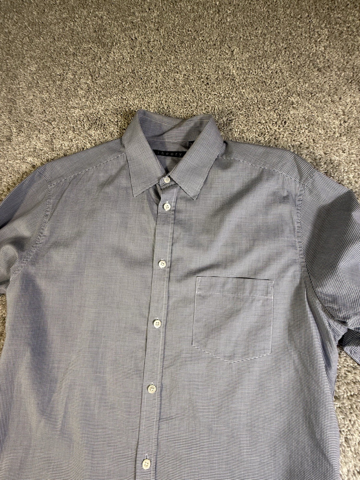 The Theory Men Blue Long-Sleeve Dress Shirt in size Large is a classic and modern piece perfect for various occasions including weddings, parties, formal events, and workwear. Made of 100% cotton, this collared shirt with a button-down closure is designed for a regular fit. The timeless blue color and button-up style make it a versatile and stylish choice for any man's wardrobe. Perfect for those looking for a high-quality and sophisticated dress shirt. 3853
