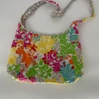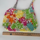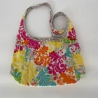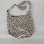 This stylish and versatile tote from Thirty One is a must-have for any woman on the go. With a beautiful gray and white polka dot exterior and a floral interior, this reversible bag is perfect for both casual and travel occasions. It features a shoulder strap handle with a 12" drop, and measures 13" in height, 11" in width, and 7" in depth. The bag has two outside pockets and one inside pocket, providing ample storage space for your essentials. It is made of a soft cotton blend exterior. This bag is great for travel, beach bag, reusable shopping bag, and is in great preowned condition. See photos there is a slight pink discoloration on the bottom of the bag as shown in photo.