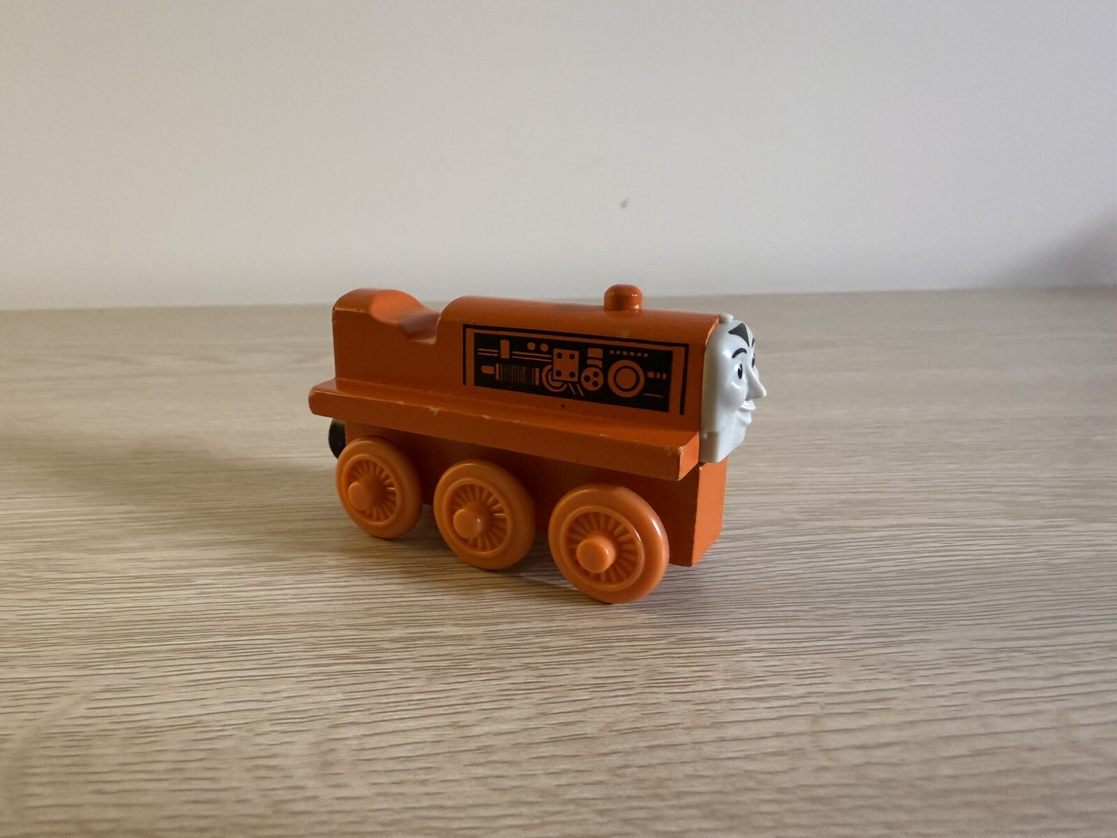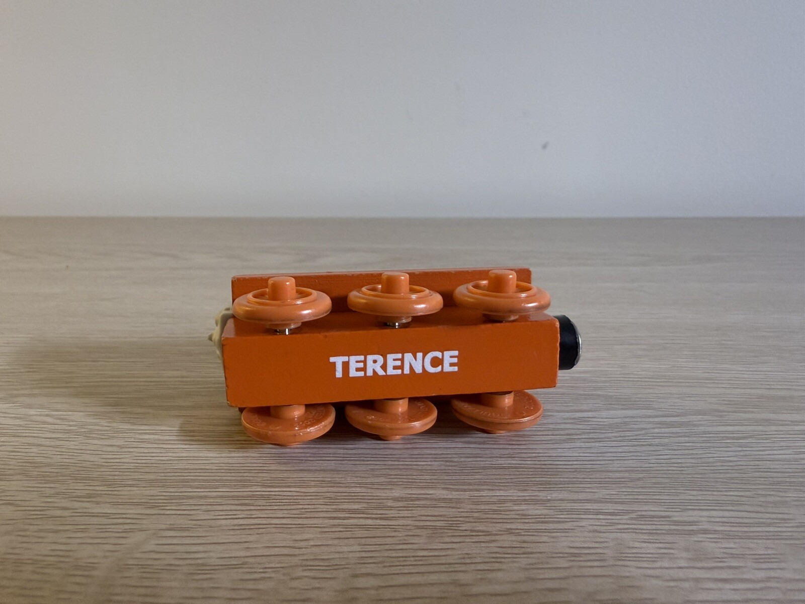 The product is a Thomas & Friends wooden train featuring the character Terrance. Manufactured in 2002 by Gullane, this toy is part of the Thomas & Friends franchise. Made of wood, it represents an action figure of the train vehicle type typically found in the 2000-2009 time period.