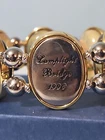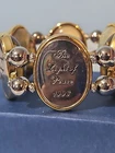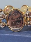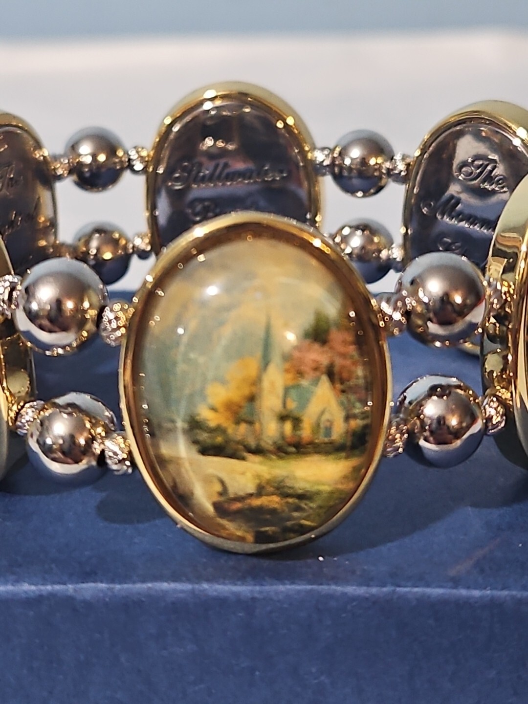 09/13/24 - BH This is a beautiful, but heavy bracelet. The 1999 back is off, will need to be glued back in. Inside diameter is approx. 2-1/2" with a little stretch. The paintings are: 1996 - Lamplight Bridge 1996 - The Light of Peace 1997 - Stillwater Bridge 1998 - The Mountain Chapel 1998 - The Mountain Chapel (yes, a duplicate) 1999 - Pools of Serenity The glass bows out over the paintings! It has 2 clear stretchy wires holding it together. There is also a gold charm "Thomas Kincade". Check out our other auctions as we will combine shipping!