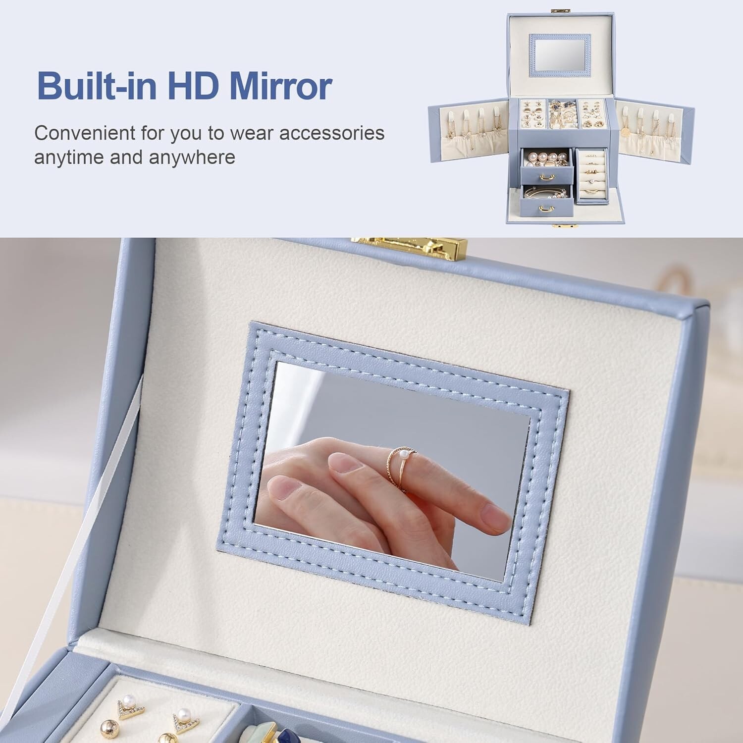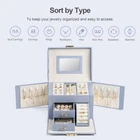 About this item Your Jewels Deserve The Best: All of your earrings, bracelets, and rings piling up on the shelf or dresser? Beautiful trinkets can't just be shoved into a dark drawer or hung on a nail, they require a stylish jewelry box for safe keeping. This jewelry box with three layer storage drawer design makes all your jewelries in perfect order. High Quality & Portable Size: Our jewelry box for women are made of high quality artificial leather and soft velvet linings, attractive surface, durable quality, that could protect your jewelry from dust and scratch. Overall Dimension: 6.89x 5.32 x 4.72 inch (L x W x H) when closed. Please know the size before purchase. With this exquisite jewelry organizer box, all your jewelries will be neatly organized and easy to reach, no messy dressing table anymore. Bulit-in Mirror: Multifunctional jewelry storage case built-in mirror, provide perfect view when you try your jewelry on. A portable, lightweight jewelry organizer case makes it easy to carry jewelry. Ingenious craft prints are simple and stylish. Multifunctional Compartment&2 Hidden Wings Compartments: Three layers jewelry storage box contains grids with different size to store your beloved jewelries. A stepped ring roll Two hidden wings with 8 necklace hooks and 2 pockets, this large jewelry box can meets all your needs of necklace storage and keep long necklaces or earrings from tangled. Perfect Gift: With elegant appearance and considerate design our display box for jewelry are pefect gift for birthday ,Christmas, Wedding day, Valentine's Day, Mother's day, Anniversary Day.