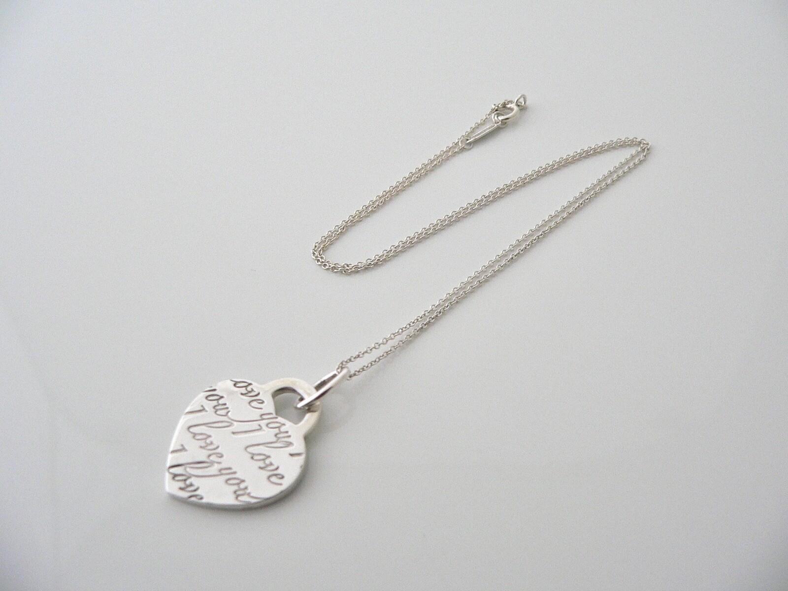 Overview: Guys, listen up! Show your love without ever saying a word! Here's a Tiffany & Co. Sterling Silver "I Love You" Heart pendant that is just perfect! Hanging from its bright Tiffany sterling silver curb chain is a wonderful heart charm with the words "I Love You" written in beautiful script form. The heart charm is currently unengraved on the back so it is ready to be personalize if you chose to do so. The necklace is simple, elegant, and classic all rolled into one item. It is a wonderful Tiffany piece to start or add to your collection. As always, the item is hallmarked and guaranteed to be 100% authentic. Particulars: The chain is 16 inches from end to end. The heart charm is a tad less than 7/8 of an inch at its widest ends. Metal & Hallmarks: Tiffany & Co. / 925 (on both the heart charm and the chain clasp) Solid 925 sterling silver Please check out my other unique and interesting Tiffany items on sale.