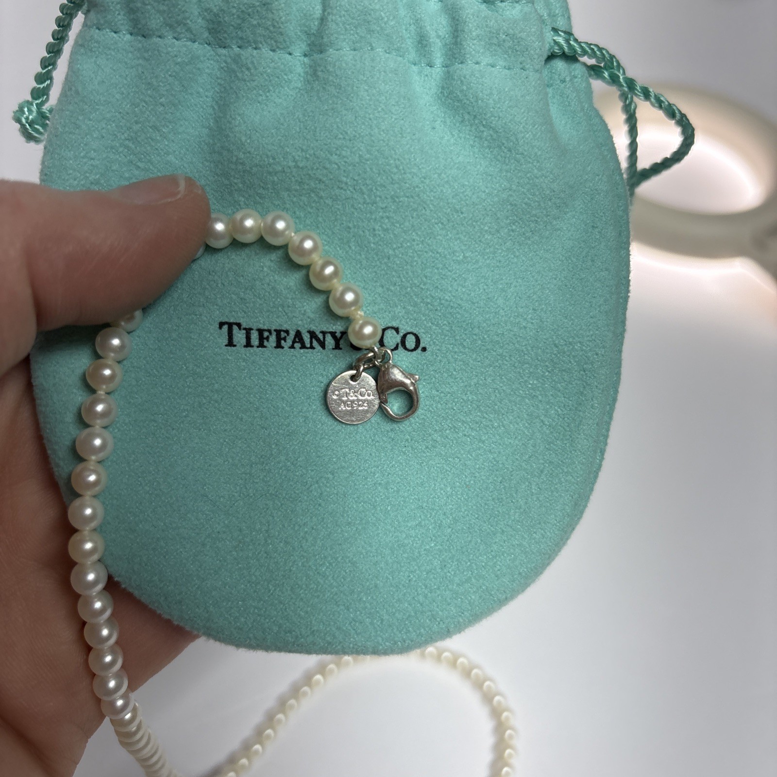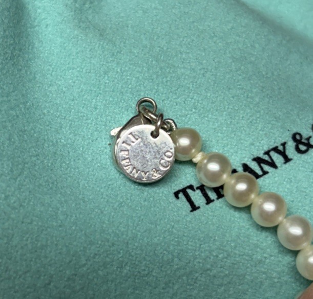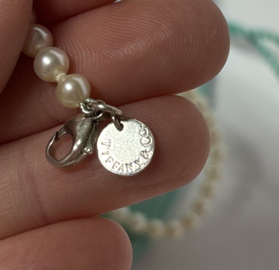 I bought this necklace from Tiffany more than a decade ago and I’ve only worn it a handful of times. The 16” length combined with the 3.5 mm pearls is dainty and delicate. It is a collar for slender necks, potentially choker length, depending on your particular shape. It is in very good shape. There are some tiny scuffs on the tag that is on the clasp. I haven’t tried to use any silver polish on the clasp- so that may make it shinier. The pearls are in excellent shape. I do not have the original box but I do have the bag, where it has been stored. I believe it was from the Ziegfeld collection but I am not 100% certain. It may be from their essential collection.