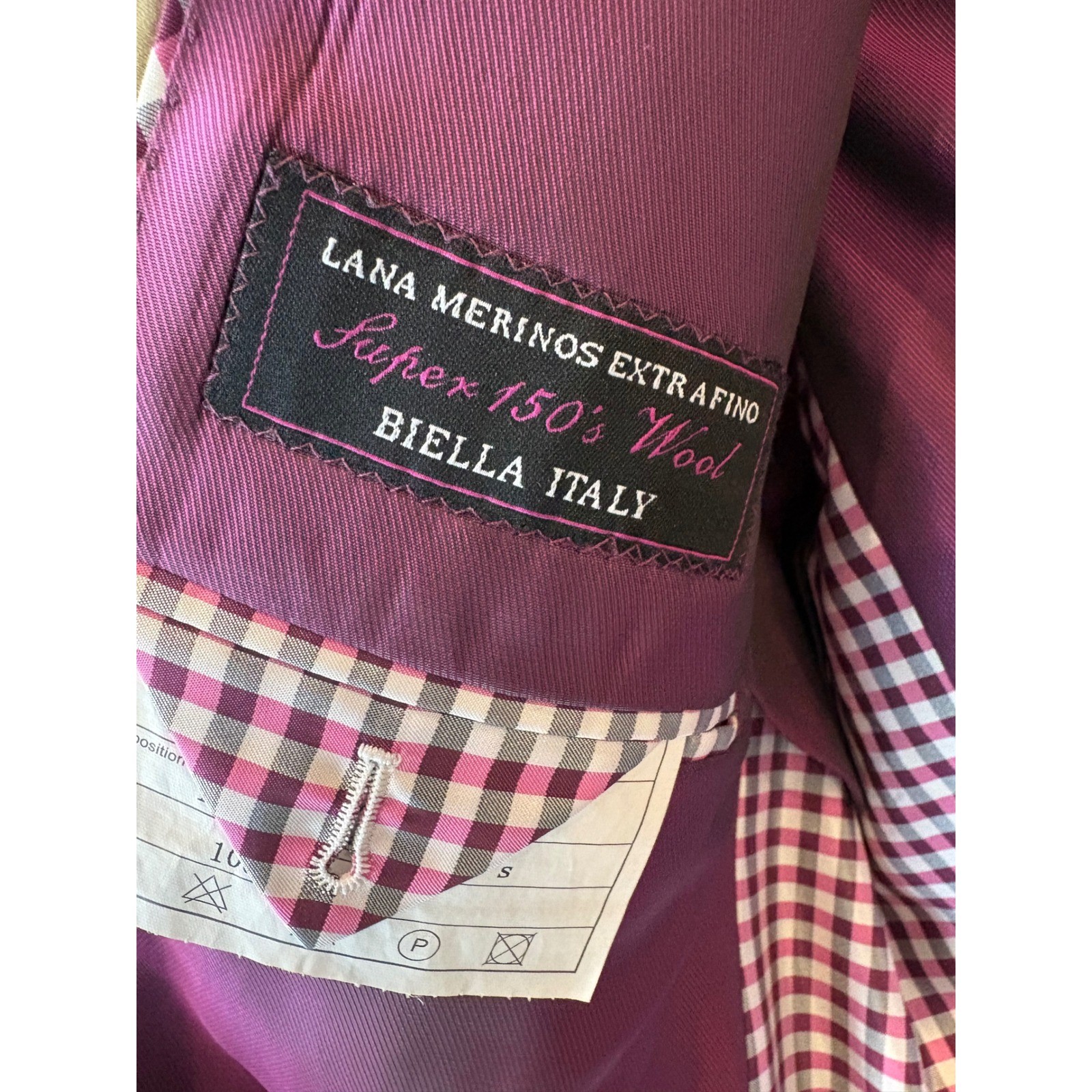 Italian-crafted blazer from the Tiglio Luxe collection features a sophisticated tan hue paired with a vibrant purple viscose lining and gingham accents. Tailored in a slim fit from premium Super 150's extrafine merino wool, this two-button jacket offers a refined silhouette with a notched lapel and double-vented back. Practical details include a welt chest pocket, flap hand pockets, and functional interior pockets, making it an ideal choice for elevated business or formal attire. Measurements: • Pit to Pit: 22" (44" chest) • Length: 32" • Sleeve Length: 27" Brand: Tiglio Luxe Model: Dandy Suit RS4361/4 Material: 100% Wool Super 150's Lining: 100% Viscose Fit: Slim Fit Pattern: Solid Color: Tan / Khaki Venting: Double Vented Closure: Two-Button Origin: Biella Italy Fabric Style: Professional / Formal Keywords: Italian Luxury, Sartorial, Wedding Guest, Business Casual, Merino Wool, Designer, Tailored, Sophisticated, Dandy Style, Office Wear, Event, Classic, Neutral