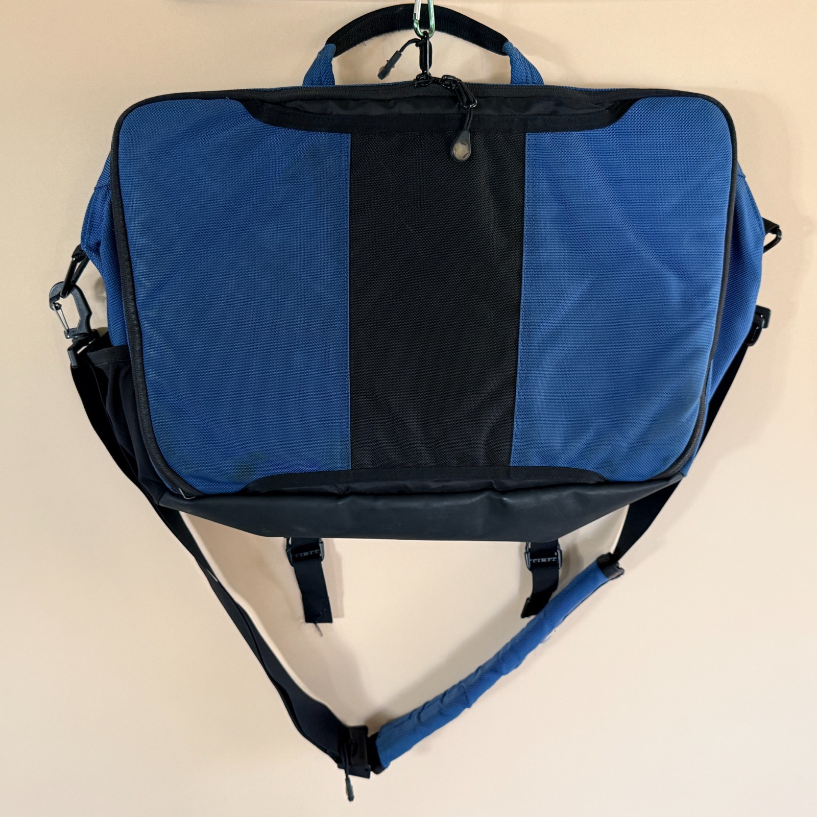 The Timbuk2 Blue Striped Crossbody Messenger Bag Sling Luggage is a medium-sized, blue nylon bag with a solid pattern and a buckle closure. It is designed for travel and casual occasions, featuring an adjustable nylon strap for added convenience. This classic messenger bag from the brand Timbuk2 is made with durable canvas fabric lining and hardware material of plastic, making it a reliable and stylish choice for men on the go.