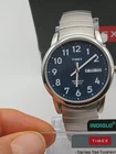 This Timex T20031 men's wristwatch features a blue dial with a 12-hour dial and date indicator. The watch has a stainless steel expansion band and is water-resistant up to 30 meters. It also has a backlight for easy reading at night and an INDIGLO night-light for extra visibility. The watch is polished with a brass and stainless steel case material and a mineral crystal display. Its quartz (battery) movement ensures accurate timekeeping. This casual style watch has a round shape, a 35mm case size, and an 8mm case thickness. The Timex T20031 is a perfect accessory for everyday wear and has a 1-year manufacturer warranty.