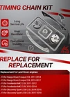 #3029 Timing Chain Kit with 2 VVT & Oil Pump Chain (9pcs) Compatible with Land Rover Range Rover Evoque 2.0L 2011-2018 Direct Timing Chain Set Replacement OE Number CJ5E6C525AD CJ5E6C524AD ► Vehicle Compatible Models: Compatible with 2011-2017 Range Rover Evoque 2.0L, for 2011-2014 Freelander MK2 2.0L, for 2014-2018 Discovery Sport L550 2.0L Direct Replacement. Please Check that the compatible vehicle model matches your car. Our Direct replacement of used parts, no modification required, ready to use. ►Interchange Part Number: LR025263 | CJ5E6C524AD | LR050849 | LR024999 | 5106956 | 2017710 | 5255301 | AG9G6C524AE | AG9G6C524AD | CJ5E6C525AD | LR033733 | LR025628 | CJ5E6C525AE | AG9G6C525AB | AG9G6C525BB | LR025264 | LR052670 | LR025000 | LR025632 Timing Chain Kit. Pleae make sure the Part number is the same with your own part, any question about it, our engineers is ready to assist. ► Package Content: Totel 9 pcs. 1x Chain; 1x I-n-t-a-k-e VVT Gear; 1x E-x-h-a-u-s-t VVT Gear; 1x Crank Gear; 1x Tensioner; 1x Arm Guide Left; 1x Guide Right; 1x Oil Pump Chain; 1x Oil Pump Guide. Replacing a Timing Chain Kit is a complex procedure that requires specialised tools and advanced mechanical knowledge. Professional installation and proper replacement of worn parts is highly recommended for optimum performance and longevity. ► Expert Assistance: For product inquiries, please provide your vehicle model, year, and photos of the old part. For product issues, kindly describe the malfunction in detail along with any error codes, and our engineers will provide a tailored solution. ► High Performance: Kirogi's Precision Engine Timing Chain Kit is meticulously engineered with high-strength alloy chains, reinforced guides & tensioners, and OE-matched sprockets to deliver critical precision timing, exceptional durability, and quiet operation, ensuring your engine runs smoothly and reliably for miles to come. What's in the box Timing Chian Kit