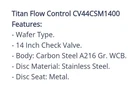 The Titan Flow CV44CSM1400 14 Inch Check Valve is a high-quality valve designed for industrial applications. With a wafer type design and a durable carbon steel body, this valve ensures reliable performance and long-lasting durability. Perfect for use in hydraulics, pneumatics, pumps, and plumbing systems, this 14-inch check valve is a vital component for maintaining fluid flow and preventing backflow in various systems. Its compact size and sturdy construction make it a popular choice for businesses and industrial settings.