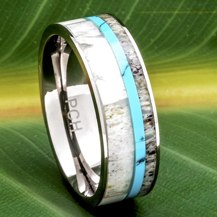 Deer Antler Ring Titanium with Turquoise Inlay 8mm Wedding Band Size 7 to 13 Comfort Fit White Tail Deer Antler Genuine Turquoise Retail $299.00 Comes with Ring Box Protective Coating for Antler and Turquoise Titanium is the only element possessing the strength of steel, yet with a weight comparable to aluminum. Titanium has a dark metallic color, but is extremely lightweight. Titanium is the only element that offers the unique combination of beauty, strength, light weight and biocompatibility. Titanium will not bend, but in the event of an emergency, a ring can be removed by a medical professional.