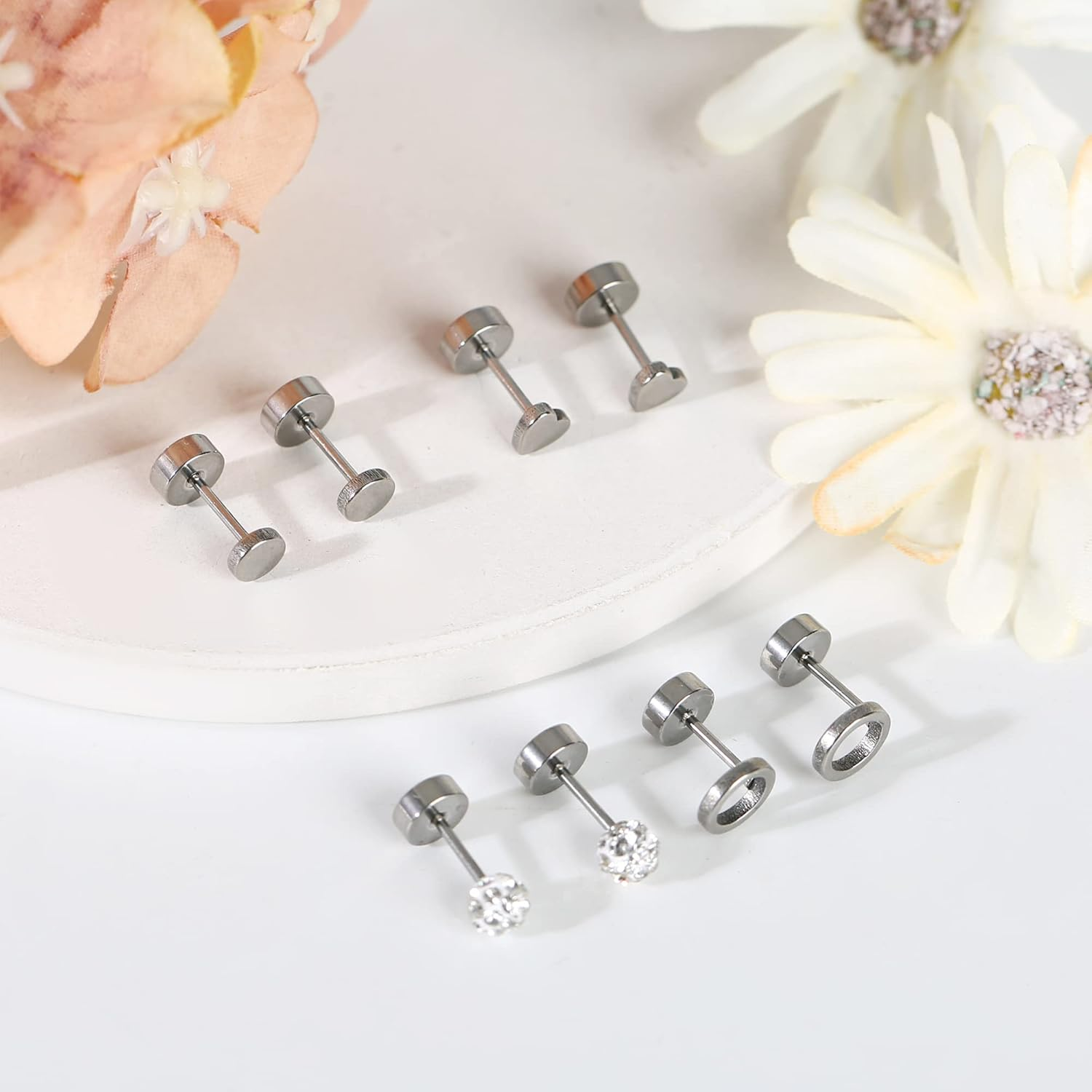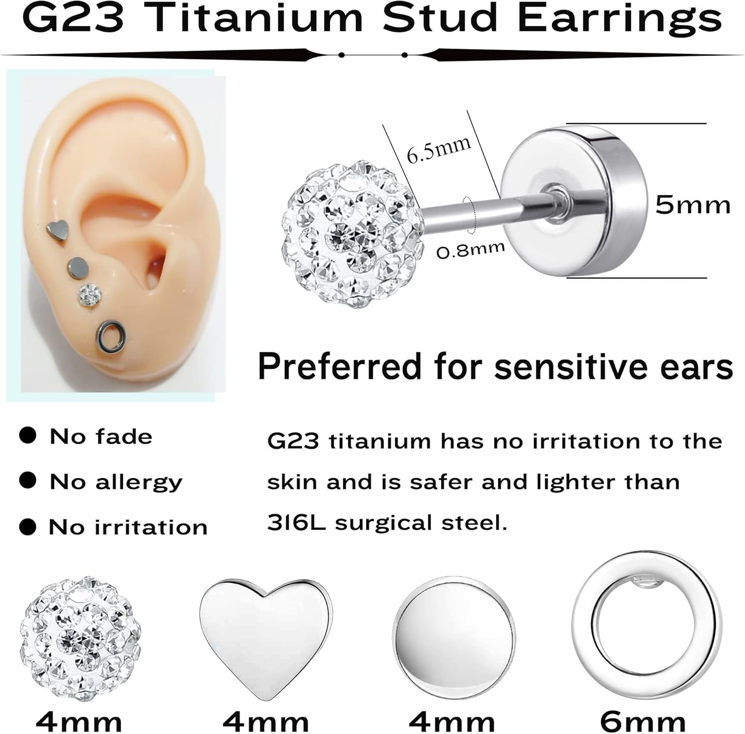 Store New Arrivals Add to Favorite View Feedback Contact Mjust Titanium Earrings for Women G23 Surgical Steel Stud Earrings for Sensitive Description Style MYER001-A Metal stamp Titanium Gem Type Cubic Zirconia Material Metal Metal g23 titanium Setting Bead Brand, Seller, or Collection Name MJust Department womens Back finding Push Back Package Dimensions 1.57 x 0.79 x 0.39 inches; 0.35 ounces Manufacturer MJust Product Description G23 Titanium Hypoallergenic Stud Earrings for Women Men Are you still upset about the itchy and swollen ears caused by earrings made of inferior materials? Look Here!!! Our 4 pairs of stud earrings are made of high quality G23 titanium.Titanium is a great jewelry material. More and more famous jewelry designers are using this material, and as a daily wear has become many people's choice. No allergy, No irritation, Pure titanium, Nickel-free, Lead-free. Let everyone wear safety and comfortable, especially for sensitive skin. The premium stud earrings are made from the pure titanium, including ear posts and ear back. The video showcases the product in use. The video guides you through product setup. The video compares multiple products. The video shows the product being unpacked. Flat Back G23 Titanium Stud Earrings Heart Stud Earrings Circle Stud Earrings Dot Stud Earrings...... Flat Back G23 Titanium Stud Earrings Star Stud Earrings Moon Stud Earrings Butterfly Stud Earrings...... Flat Back G23 Titanium Stud Earrings Opal Stud Earrings AB Cubic Zircon Stud Earrings Colored Cubic Zircon Stud Earrings...... Flat Back G23 Titanium Stud Earrings Circle Stud Earrings Cubic Zircon Stud Earrings Faux Pearl Stud Earrings...... Heart Earrings Stud Earrings Moon and Star Stud Earrings Cubic Zircon Stud Earrings Circle Stud Earrings 1 StyleA 2 StyleB 3 StyleC 4 StyleD What are these made? Our flat back earrings are made of G23 Pure Titanium, No allergy, No irritation, Pure titanium, Nickel-free, Lead-free. Let everyone to wear it safely and comfortably, especially for sensitive skin, and is a great jewelry material . What gauge are these? Titanium Earrings studs Size of Gauge:20G(0.8mm) pin thickness, Post Length:6mm, flatback size:5mm. Well-Fitted and Stackable, A Solid Choice for People Who Have Many Ear Piercings. Can these stud earrings be worn in the shower? Yes, These stud earrings are made of G23 Pure Titanium, there is no need to worry about allergies or color fading, and you can wear them safely in the shower or swimming. How should these stud earrings open? The back screws on and off which is really nice and feels better on your ears ABOUT US We offer the best prices around on high quality products. Our E-store includes media such as books, movies, music and games while offering electronics, toys, sporting apparel, clothing, tools, general home, garden items and more. SHIPPING We are always working hard to ensure your package arrives as soon as possible. Please understand that some factors like weather, high postal traffic, and the performance of shipping companies are outside of our control. We offer free shipping to the lower 48 states and ship within 2 business days of payment, usually sooner. We do not accept P.O. Boxes. Please provide a physical address. RETURNS We offer a 30-Day Return Policy on items which you are not completely satisfied with. You have the option for a full-refund or an exchange of the item. No returns are available on items shipped outside of the USA. PAYMENT We accept PayPal. CONTACT US This page content is yet to come Please ad us to your favorite seller and visit again later Thank You CUSTOMER SATISFACTION We try our very best to make sure every customer is completely satisfied. If there's a problem, message us! We're happy to help.