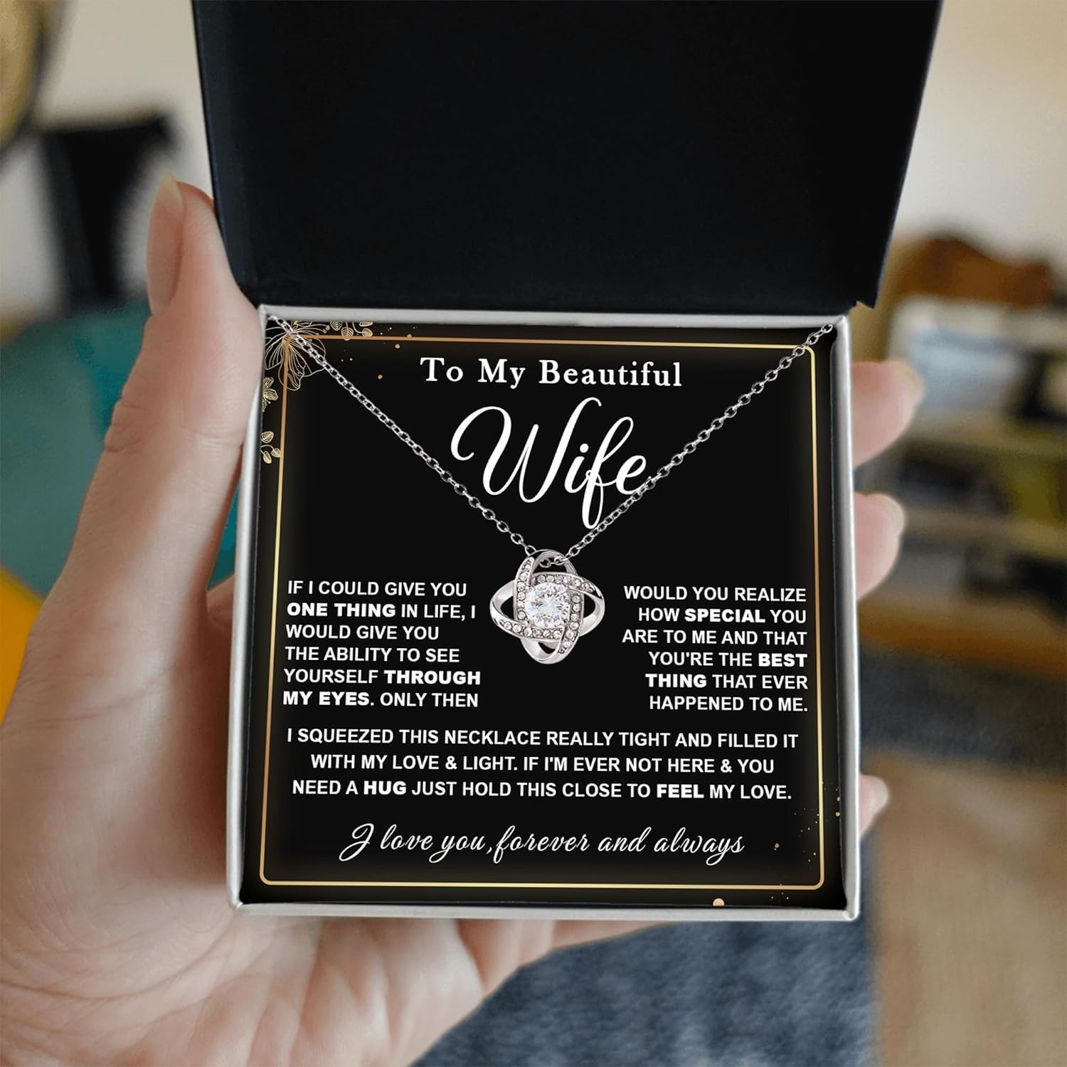 Free eBay listing template designed by dewiso.com Chiside To My Wife Necklace With Message And Gift Box, Valentine Christmas Birthday Gifts For Wife From Husband, Anniversary Necklace For Wifes, Husband Wifes Gift FREE AND FAST SHIPPING! Timeless Love Symbol: The Necklace is more than simply jewelry; it represents your enduring love and loyalty. This 'wife gifts from husband romantic' necklace lets you show your love and appreciation for your beloved wife. Elegant and Meaningful Design: With its traditional and elegant design, this gorgeous necklace for wife is a versatile piece that can be worn on any occasion and complements both casual and formal outfits. A Thoughtful Message and Meaningful Gift for Special Occasions: This beautiful necklaces for women with card message is the perfect way to express your love on a birthday, Valentine's Day, Christmas, or anniversary necklace for wife. Quality Materials: This lovely Love Knot Necklace is 14k white gold plated over stainless steel and comes with an adjustable chain. This necklaces for my wife are made to last, so she can cherish it for years to come. Gift-Ready Packaging: If you're looking for gifts for my wife's birthday, we has presented the necklace in a fashionable gift box, the necklace comes with gift box and is ready to be given and appreciated, making it a great gift choice for your loving wife. Product We offer a 30-Day Return Policy on items which you are not completely satisfied with. You have the option for a full-refund or an exchange of the item. No returns are available on items shipped outside of the US . Shipping We offer Free Shipping to the US and ship within 2 business days of payment, usually sooner. We use UPS express shipping. That's why your products are usually delivered within 3 days . Contact We try our very best to make sure every customer is completely satisfied. If there's a problem , message us! We're happy to help. 24/7 live chat available.