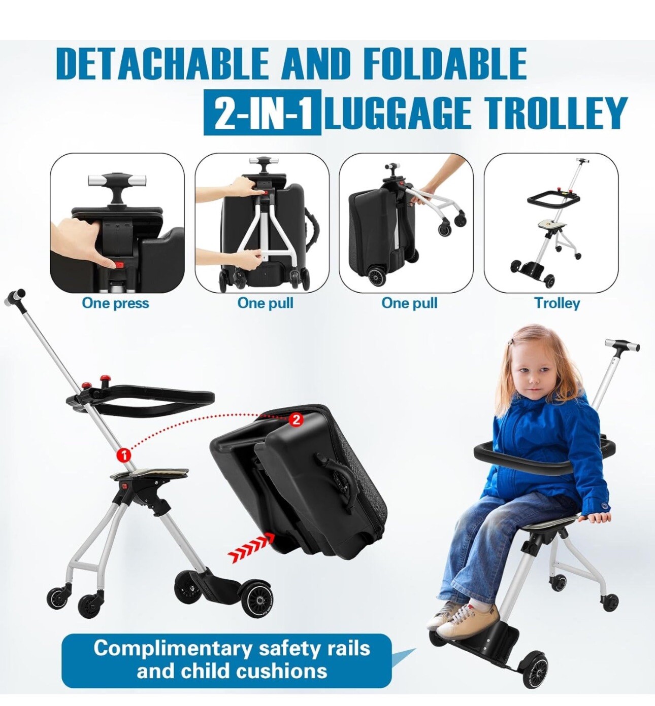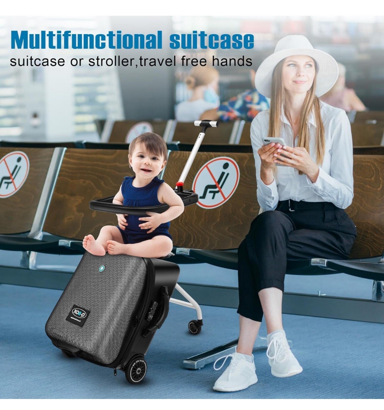 2 in 1 Design Luggage: our luggage with seat for kids adopts the 2 in 1 design of luggage and trolley, which can take children and luggage away at once, giving you a different experience; With the thick aluminum alloy material, its maximum bearing capacity is about 110.2 lb/ 50 kg, suitable for 1-5 years old children, designed well, children can ride more comfortable, and the strong guardrail will keep your children safe Detachable and Foldable Design: the child seat on the suitcase can be retracted with push and pull, and the trolley and suitcase can be quickly detached, and the side handles allow you to lift it easily when you can't use the wheels; It can easily fit into the overhead baggage compartment of the aircraft, easy and convenient, whether it is weekend shopping, or going out to play, it can be a good choice for families Quality Materials: the suitcase with seat for kids is made of quality material, mainly made of ABS and PC material, with 3 layer composite compressive structure, wear resistant and waterproof, the 4 wheels of the suitcase are mainly made of PU, the structure is made of aluminum alloy, and the inner liner is made of polyester Large Capacity: the 20 inch expandable luggage with spinner wheels maximizes your packing capacity, and it can be expanded to a capacity of 38L, small size with large capacity; With the flexible partition structure of the suitcase and the versatile grid storage bags, you can easily pack your clothes, so that the items are neatly arranged, meeting your travel and business needs well Guardrail Installation Operation: the guardrail of the luggage with kids seat is easy to assemble, just push the buckle around the guardrail to the child handrail of the pull rod, turn the front end of the guardrail, tighten the screws, then insert the other half into the socket of the bracket until the safety buckle appears, and finally pull the guardrail back to re test to confirm that it is not pulled out, it will be ready Description Features: The front 2 wheels of the luggage with seat can rotate 306 degrees, safe and stable, low noise, and the high tensile strength zipper head can provide long lasting durability. These large suitcases with child seat are considerate and pragmatic presents to your family members, friends who have kids, conveying your love, care and kindness to them, getting relationships and emotions closer with each other. Specifications: Main material: ABS, PC, PU, aluminum alloy Main color: black Size: about 20 inch