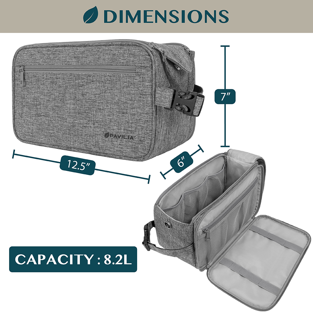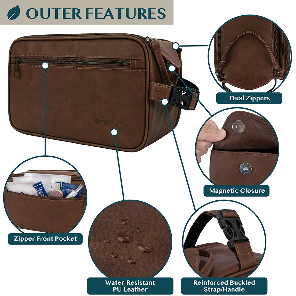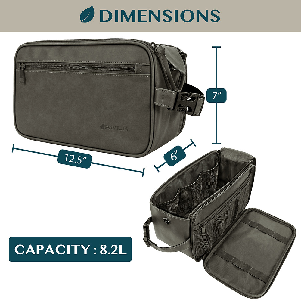 Toiletry Bag For Mens Large Dopp Kit Double Zipper Travel Shaving Bag Synthetic PAVILIA Toiletry Bag for Men, Travel Toiletries Bag | Water-resistant Dopp Kit, PU Leather Shaving Bag Organizer for Toiletry Accessories, Grooming, Hygiene, Cosmetic Aside from a spacious main compartment, the large toiletry bag is equipped with 2 side compartments and 9 mesh pockets to fit anything you need for a long trip such as hygiene and cosmetic items, shampoo, shaver, lotion etc. Additional elastic straps are handy for keeping slender items like a toothbrush, toothpaste, hair brush, or shaving razors easily accessible. The double zippers on top are attached to a handle, allowing them to quickly unzip with one swift motion for complete access to the large main compartment. The top can also be secured to a side magnet to prevent the zippers from moving around during transport. Made from high density PU leather with added side padding for durability. The lining is water-resistant to prevent liquid sprays and splashes from entering the bag. Simply wipe clean with a damp cloth. All bags come with a stylish striped fabric interior. The handle has an integrated buckle to easily attach to luggage, backpacks, as well as used for handing on hooks for easy access to your toiletries in hotel rooms, in the showers, or on flights. Measures 10.5 x 5.5 x 6 inches (L x W x H) and is collapsible for storing. Made with extra durable polyester Pavilia is the Comfort You Can Trust Our Vision To provide premium home goods that improves and enriches the life of everyone. We will continue to innovate and bring exciting products to market so you can enjoy life more! Product Details Brand PAVILIA Color Size Large Manufacturer PAVILIA Product Type Toiletry Bags PERFECT TRAVELING BAG - Aside from a spacious main compartment, the large toiletry bag is equipped with 1 side compartments, 1 side pocket, and 9 mesh pockets to fit anything you need for a long trip such as hygiene and cosmetic items, shampoo, shaver, lotion etc. Additional elastic straps are handy for keeping slender items like a toothbrush, toothpaste, hair brush, or shaving razors easily accessible. FAST & EASY OPEN - The double zippers on top are attached to a handle, allowing them to quickly unzip with one swift motion for complete access to the large main compartment. The top can also be secured to a side magnet to prevent the zippers from moving around during transport. DURABLE MATERIAL - Made from high density PU leather with added side padding for durability. The lining is water-resistant to prevent liquid sprays and splashes from entering the bag. Simply wipe clean with a damp cloth. All bags come with a stylish striped fabric interior. CLIP-ON HANDLE FOR HANGING - The handle has an integrated buckle to easily attach to luggage, backpacks, as well as used for handing on hooks for easy access to your toiletries in hotel rooms, in the showers, or on flights. DIMENSIONS - Measures 10.5 x 5.5 x 6 inches (L x W x H) and is collapsible for storing. Check out my other items. - Powered by