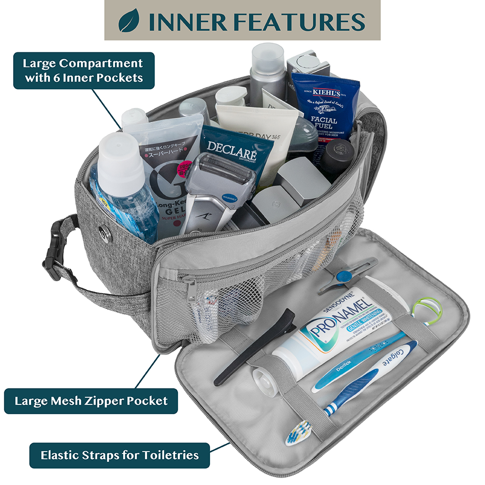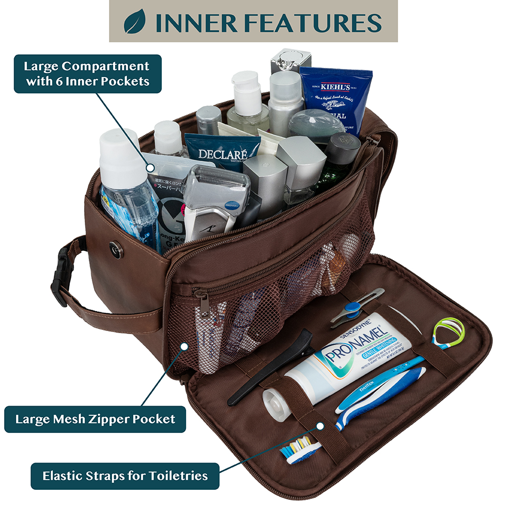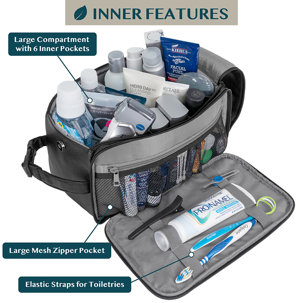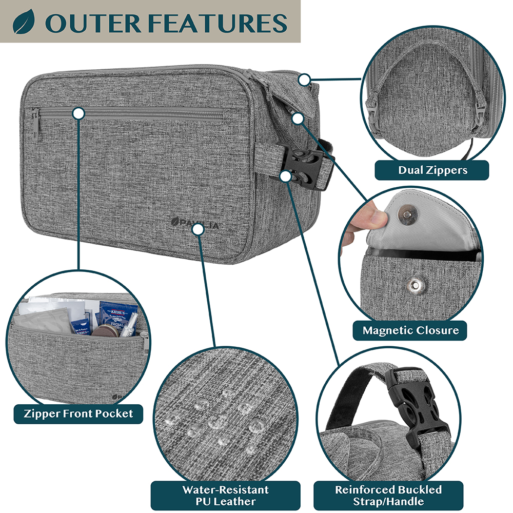 Toiletry Bag For Mens Large Dopp Kit Double Zipper Travel Shaving Bag Synthetic PAVILIA Toiletry Bag for Men, Travel Toiletries Bag | Water-resistant Dopp Kit, PU Leather Shaving Bag Organizer for Toiletry Accessories, Grooming, Hygiene, Cosmetic Aside from a spacious main compartment, the large toiletry bag is equipped with 2 side compartments and 9 mesh pockets to fit anything you need for a long trip such as hygiene and cosmetic items, shampoo, shaver, lotion etc. Additional elastic straps are handy for keeping slender items like a toothbrush, toothpaste, hair brush, or shaving razors easily accessible. The double zippers on top are attached to a handle, allowing them to quickly unzip with one swift motion for complete access to the large main compartment. The top can also be secured to a side magnet to prevent the zippers from moving around during transport. Made from high density PU leather with added side padding for durability. The lining is water-resistant to prevent liquid sprays and splashes from entering the bag. Simply wipe clean with a damp cloth. All bags come with a stylish striped fabric interior. The handle has an integrated buckle to easily attach to luggage, backpacks, as well as used for handing on hooks for easy access to your toiletries in hotel rooms, in the showers, or on flights. Measures 10.5 x 5.5 x 6 inches (L x W x H) and is collapsible for storing. Made with extra durable polyester Pavilia is the Comfort You Can Trust Our Vision To provide premium home goods that improves and enriches the life of everyone. We will continue to innovate and bring exciting products to market so you can enjoy life more! Product Details Brand PAVILIA Color Size Large Manufacturer PAVILIA Product Type Toiletry Bags PERFECT TRAVELING BAG - Aside from a spacious main compartment, the large toiletry bag is equipped with 1 side compartments, 1 side pocket, and 9 mesh pockets to fit anything you need for a long trip such as hygiene and cosmetic items, shampoo, shaver, lotion etc. Additional elastic straps are handy for keeping slender items like a toothbrush, toothpaste, hair brush, or shaving razors easily accessible. FAST & EASY OPEN - The double zippers on top are attached to a handle, allowing them to quickly unzip with one swift motion for complete access to the large main compartment. The top can also be secured to a side magnet to prevent the zippers from moving around during transport. DURABLE MATERIAL - Made from high density PU leather with added side padding for durability. The lining is water-resistant to prevent liquid sprays and splashes from entering the bag. Simply wipe clean with a damp cloth. All bags come with a stylish striped fabric interior. CLIP-ON HANDLE FOR HANGING - The handle has an integrated buckle to easily attach to luggage, backpacks, as well as used for handing on hooks for easy access to your toiletries in hotel rooms, in the showers, or on flights. DIMENSIONS - Measures 10.5 x 5.5 x 6 inches (L x W x H) and is collapsible for storing. Check out my other items. - Powered by