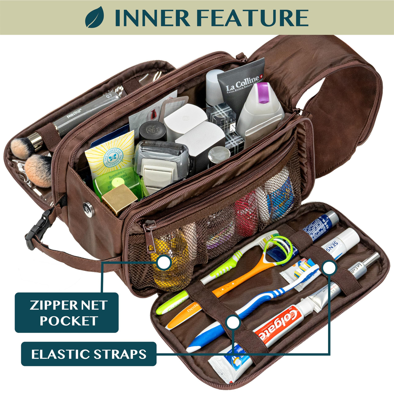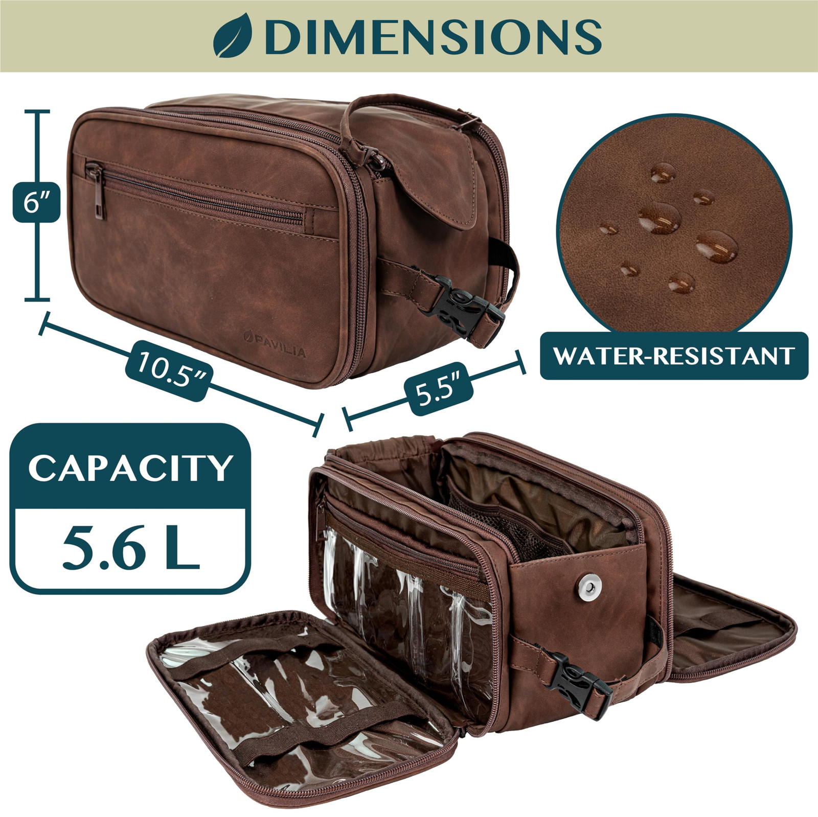 MENS TOILETRY BAG: This functional PU leather toiletry travel bag has a large compartment and side pockets with additional pockets to hold all your toiletry, shaving, and grooming accessories. Equipped with elastic bands and additional mesh pockets to keep your hygiene items secured while traveling, weekend trip at hotel, or at home, this cosmetic make up case will help you stay organized. LARGE OPENING TOILETRIES TRAVEL BAG: This toiletry bag organizer has double zipper design that allows for easy access to the large main compartment. With one simple pull on the handle, you can easily access key accessories such as shaving kit, tooth brush, and shampoo. This toiletry travel bag has the convenient design that helps you stay organized and makes this travel bag case an essentials during any traveling, flights, hotel stay, and weekend vacation. WATER RESISTANT TOILETRY BAG DOPP KIT: This toiletry case kit is made from high density PU leather with added side padding for durability and extra protection to keep your toiletries safe and protected during travel. The lining is water-resistant to prevent liquid splashes from entering the bag or luggage. The toiletry bag also offers excellent wet/dry separation so you can keep wet accessories in a separate compartment from dry toiletries during camping, road trips, weekenders. TRAVEL ESSENTIALS FOR MEN: The handle has a clip-on buckle to easily attach any bathroom bars and hangers so you can easily access this travel organizer in hotel rooms, bathroom, and showers. Its compact design means the toiletry bag is easy to pack and fits well in luggage and backpacks. This makes a great gift for father, men, boyfriend, uncle, husband, groomsmen and is especially appropriate for fathers day, Christmas, Birthday and those who love to travel. LARGE CAPACITY TOILETRY TRAVELING BAG: Measures 10.5 x 5.5 x 6 inches (L x W x H), the toiletry bag is large and roomy with ample room to all essentials, accessories and toiletries during travel or home use. Easily fits all shaving kits, toothpastes, showering bathroom tools in this bag. Simply wipe clean with a damp cloth.