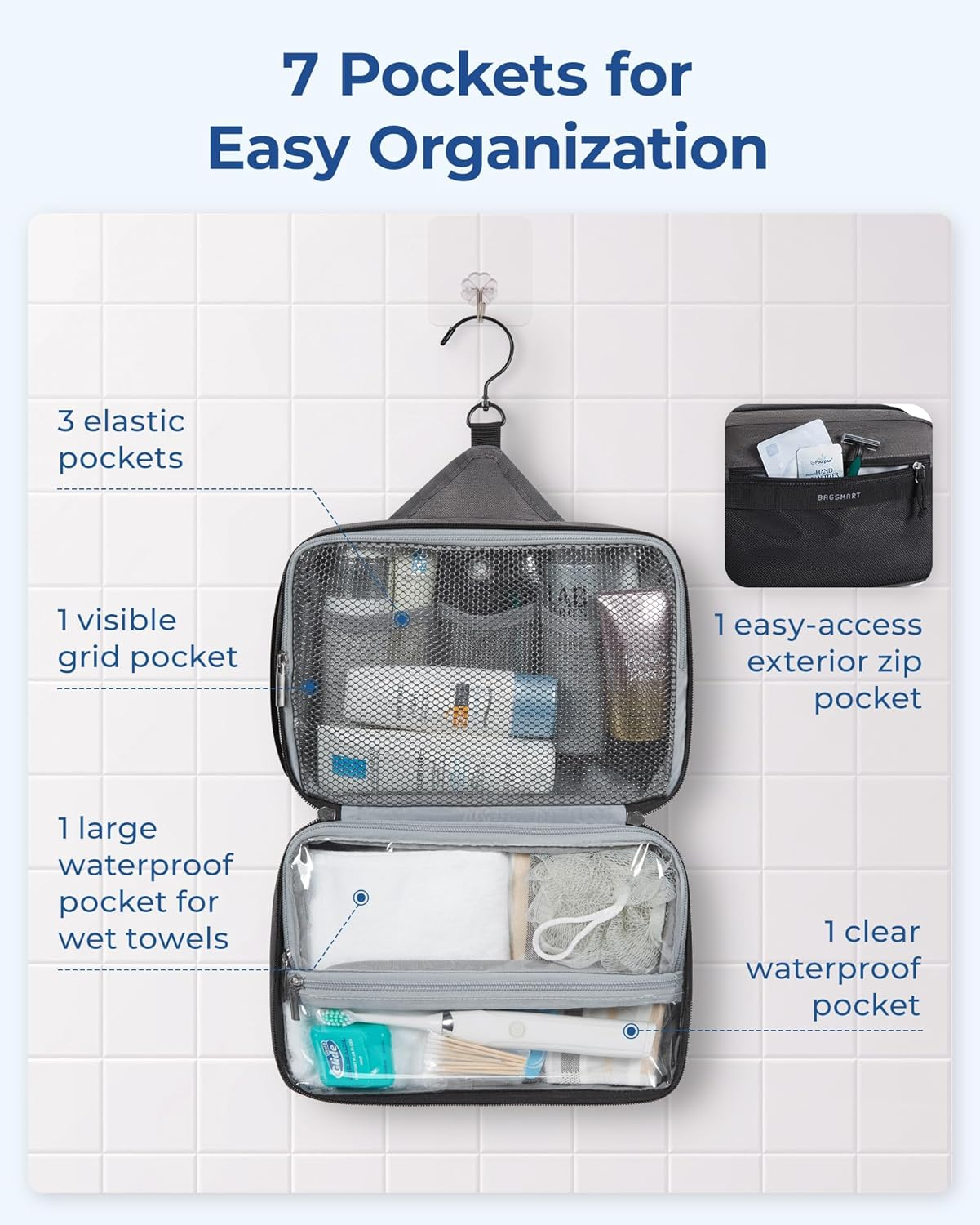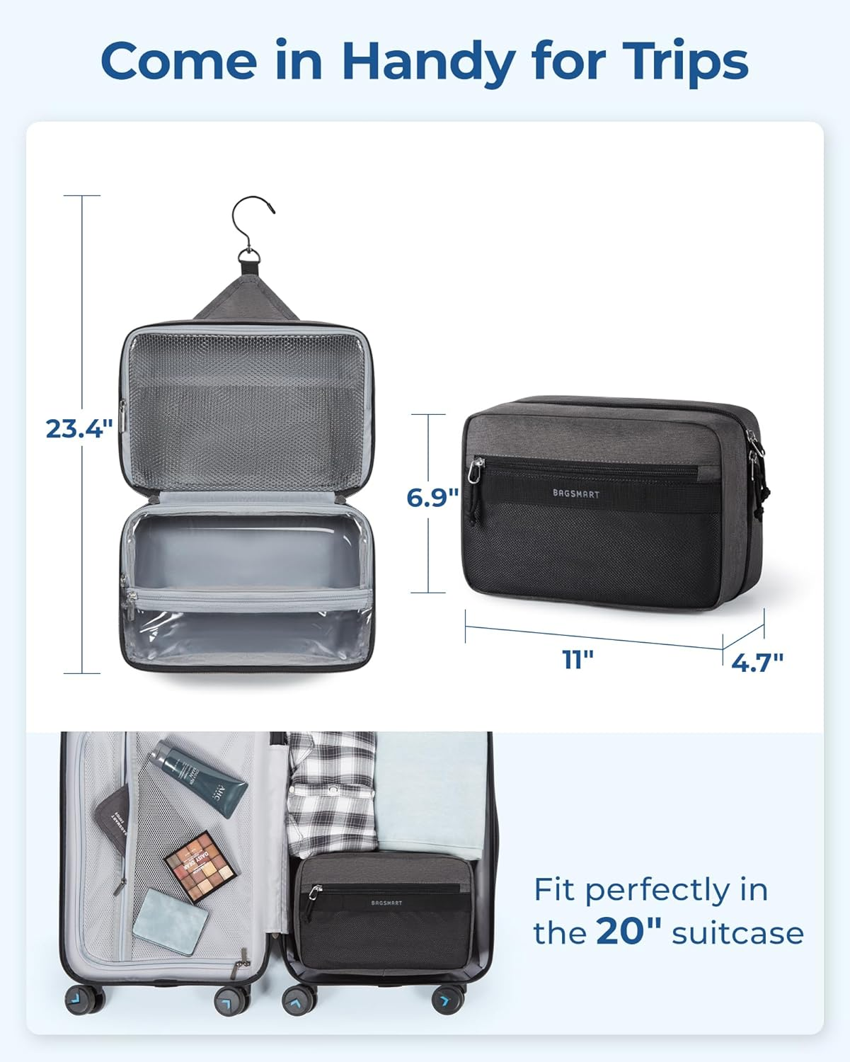 Large Capacity & Easy Organization: Measuring 11.02 x 6.289 x 4.72 inches, this toiletry bag boasts ample space with well-designed compartments, including three mesh pockets and a large section for essentials like face wash and shampoos. Made from durable, water-resistant PVC mesh, it features a zippered closure for secure storage and easy cleaning Wet-Dry Separation Design: This toiletry bag features a dual-compartment lower section for optimal organization. The spacious main compartment is perfect for wet items such as towels and bath products. A waterproof zippered pocket keeps essentials like toothbrushes and toothpaste secure. An additional external pocket offers quick access to small items like your smartphone, ID, wallet, or band-aids, ensuring convenience and efficiency Premium Material: This toiletry bag is crafted from robust polyester fabric for unmatched durability. Equipped with high-quality metal zippers and nylon cords, it offers a smooth glide for effortless opening, even when your hands are wet or soapy. Travel Convenience: This toiletry bag boasts a 360° swivel hook for easy hanging in any setting, including bathrooms and gym lockers. Made with water-resistant fabric, it protects your essentials from moisture. The robust side handle enhances portability, making it ideal for travelers. Versatile Use: Perfect for men and women, this stylish toiletry bag suits gym sessions, travel, business trips, or daily use. Its practical design makes it an ideal gift for occasions like Valentine's Day, Father's Day, Christmas, and New Year's. Product Description BAGSMART Toiletry Bag for Men and Women