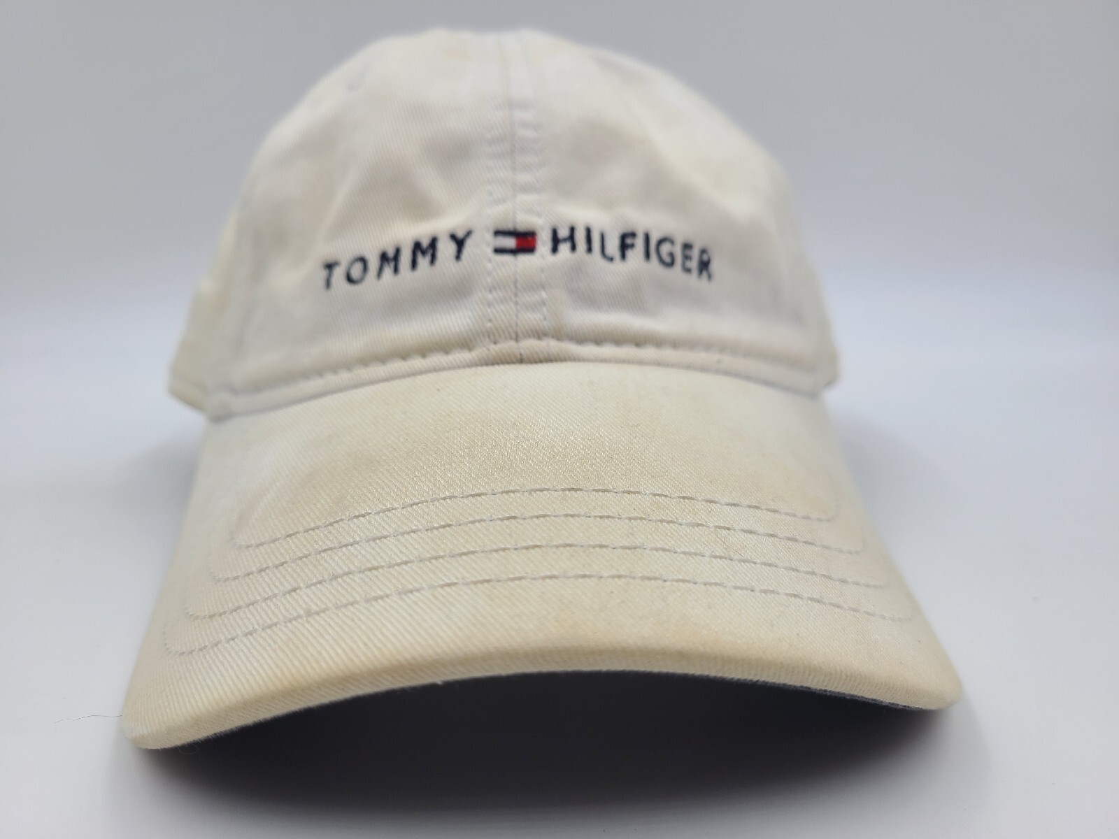 Has stains/discoloration all around the hat as seen in photos. Tommy Hilfiger Distressed Leather Strapback Adjustable Hat Cap Men Women White. EACH ADDITIONAL HAT PURCHASED IS ONLY $1 ADDED SHIPPING!