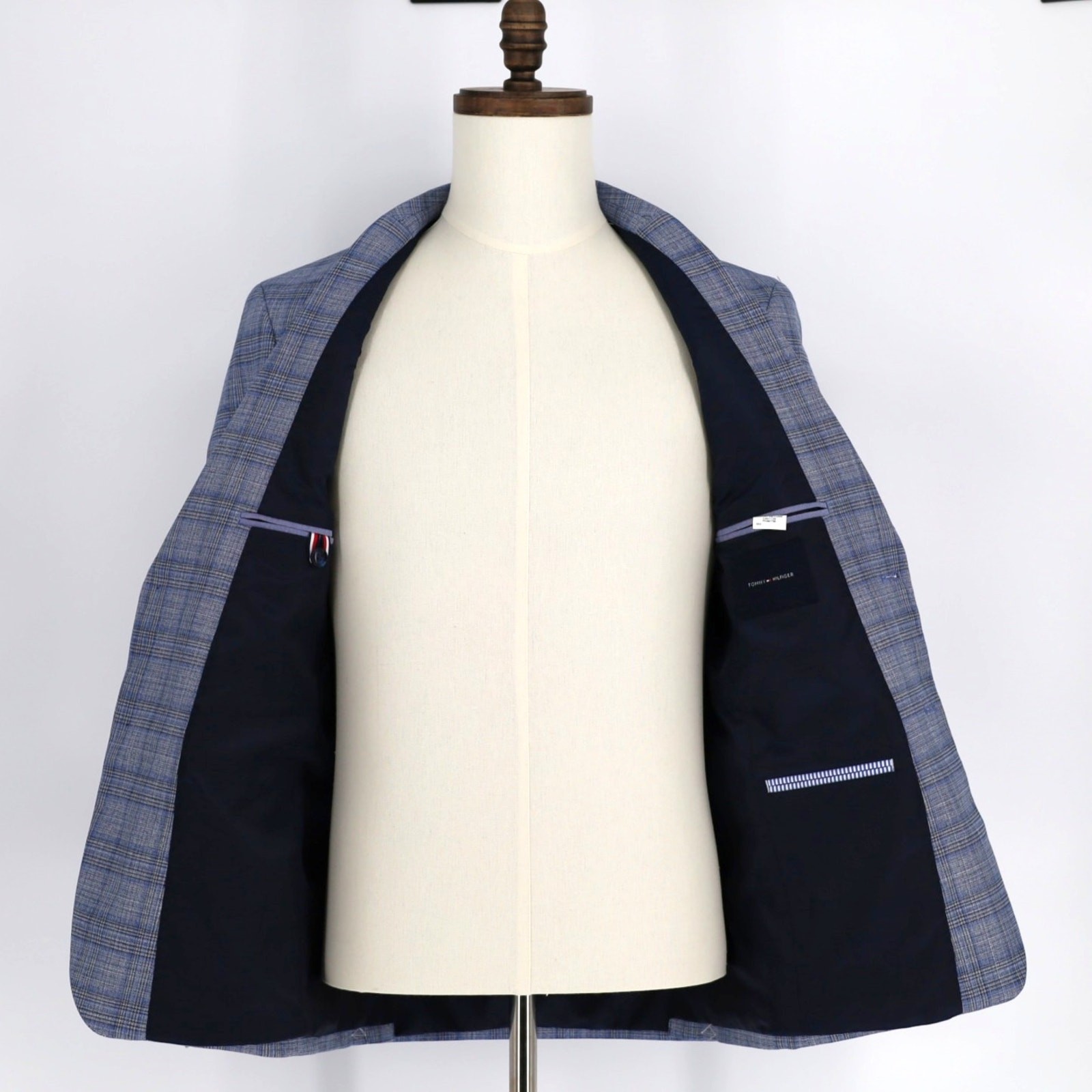 Tommy Hilfiger Men's Light Blue Plaid Conrad Modern-Fit Suit Blazer Size 42L New with tags MSRP $295 Sport coat that balances both classic and modern fashion Athletic fit through the shoulders, chest, and waist with higher armholes and trimmer sleeves Notch lapel Two-button closure Four-button cuffs Two front flap pockets Left chest welt pocket Side vents Fully lined 79% polyester, 19% viscose, 2% spandex Lining: 100% polyester Dry clean Length 33" Armpit to armpit 21.5" Sleeve 26.5" Shoulders 18.5"