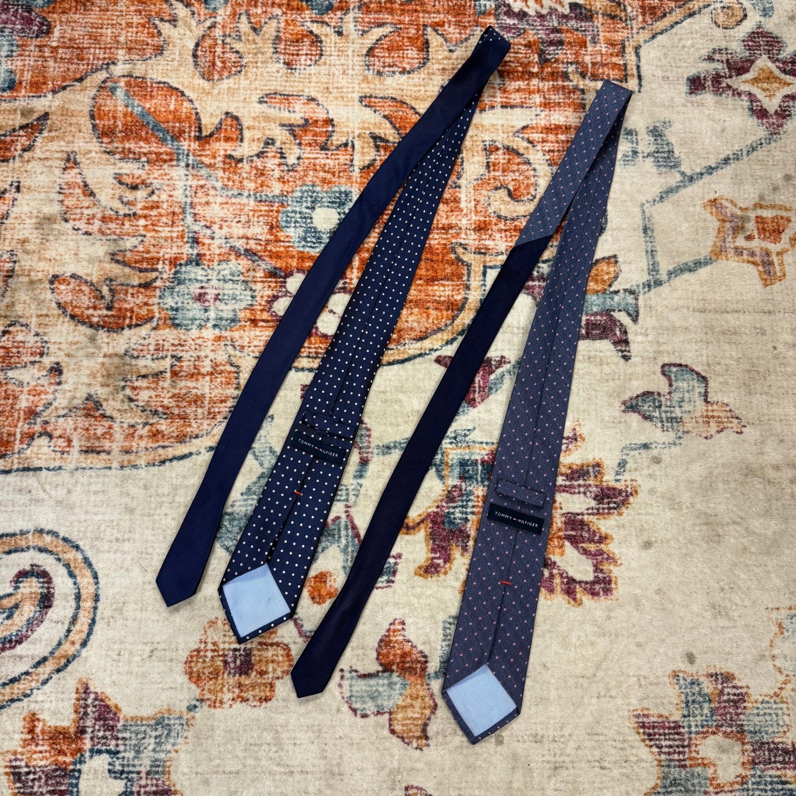 Two Tommy Hilfiger men's silk neckties in a deep navy blue featuring classic polka dot patterns. One tie showcases small white polka dots, and the other presents subtle pink polka dots. Both ties are made of high-quality silk, offering a smooth texture and elegant drape. The detailed stitching and iconic Tommy Hilfiger branding are visible on each tie. Department: Men Type: Tie Material: 100% Silk, Silk Blend, Cotton Blend Style: Designer Pattern: Polka Dot Theme: Preppy Item Width: Classic Accents: Logo Fabric Type: Silk Blend Item Length: Classic (57"-60") Number of Pieces: 2 Piece Country of Origin: China Keywords: silk tie, dot pattern, formal wear, business attire, classic style, designer tie, menswear, accessory bundle, gift for him, party accessory, dress necktie, jacquard weave Item is preowned, effort has been made to ensure all flaws are displayed photos serve as additional description Sizing varies by manufacturer and time period, please see measurements.