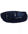 Tommy Hilfiger Men's Tonal Braided Harness Buckle Belt size: XL (size 42-44) color: Navy 1-1/4" wide elastic web strap Tonal braided design with faux leather trim at tip and buckle ends Matching harness buckle Tommy Hilfiger Flag logo ornament inlaid on strap keeper loop Polyester/rubber/polyurethane/leather