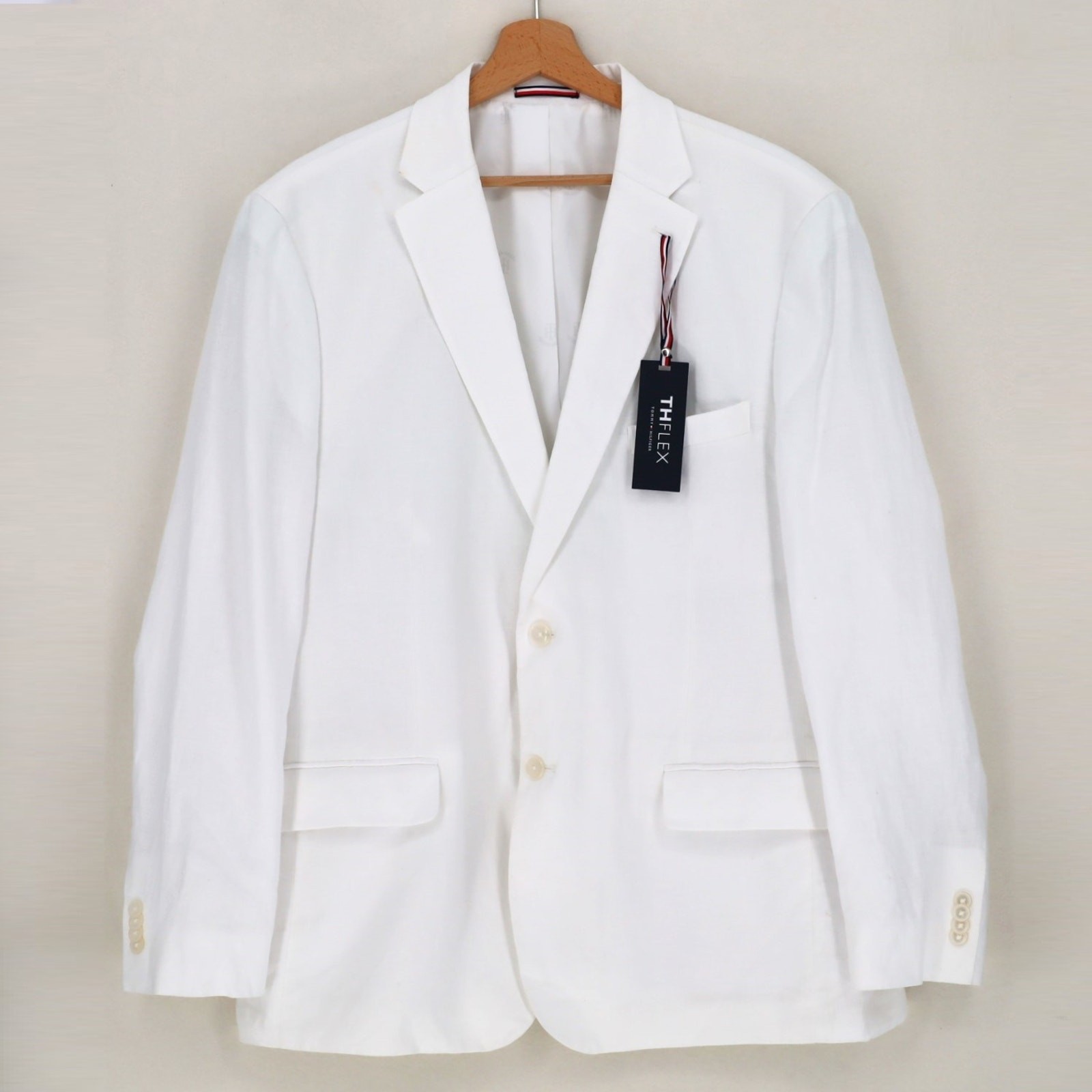 Tommy Hilfiger Men's White Flex Stretch Linen Modern-Fit Suit Jacket Size 46R New with tags MSRP $360 Athletic modern fit Notched lapel Two-button closure Four-button cuffs Two front flap pockets Left chest welt pocket Interior welt pockets Side vents Partially lined Stretch performance 100% linen Lining: 100% polyester Dry clean Length 30" Armpit to armpit 23.5" Sleeve 26" Shoulders 20"