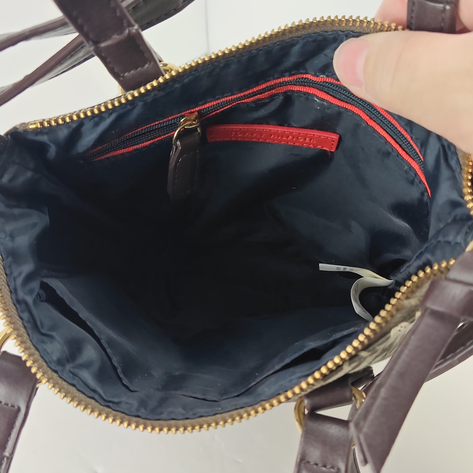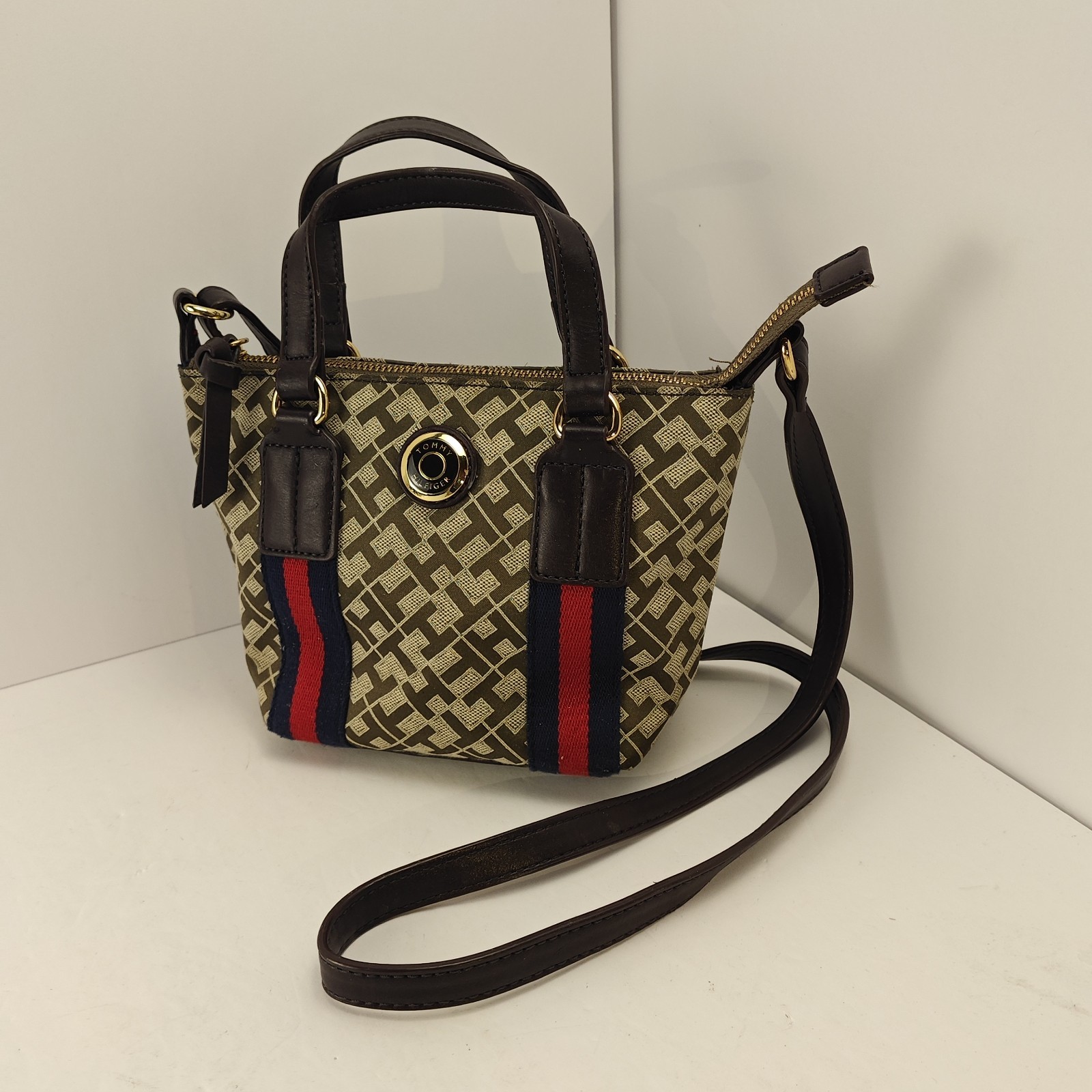 The Tommy Hilfiger Vintage Signature Monogram Crossbody Micro Tote Bag is a stylish and versatile accessory for women. Featuring a classic monogram pattern and Tommy Hilfiger branding, this mini tote bag offers a modern twist on a vintage aesthetic. Made of faux leather with gold hardware accents, this black bag is perfect for carrying essentials with its zip closure and crossbody strap handle style. Whether for a night out or a day on the go, this Tommy Hilfiger bag is both fashionable and functional.