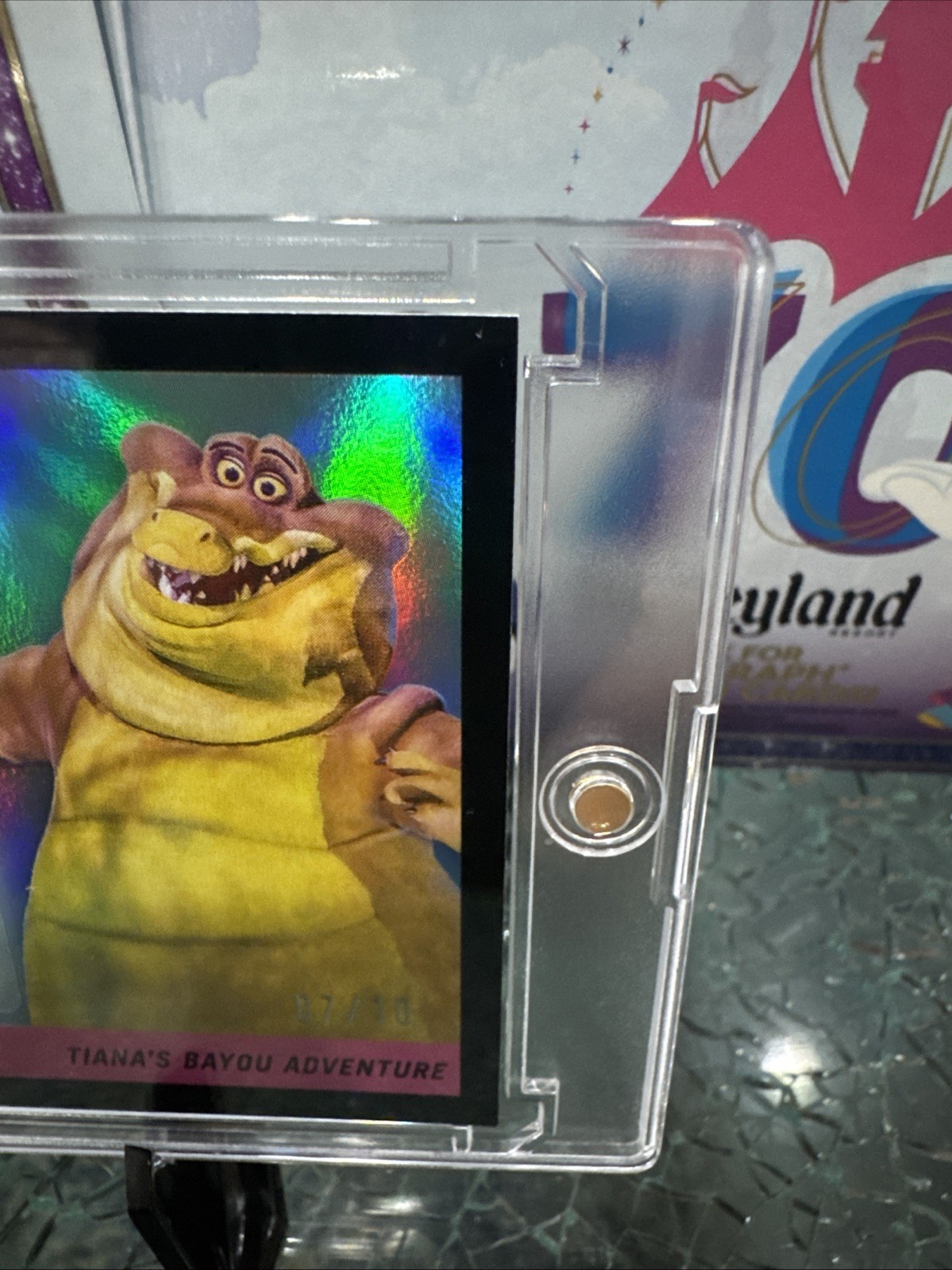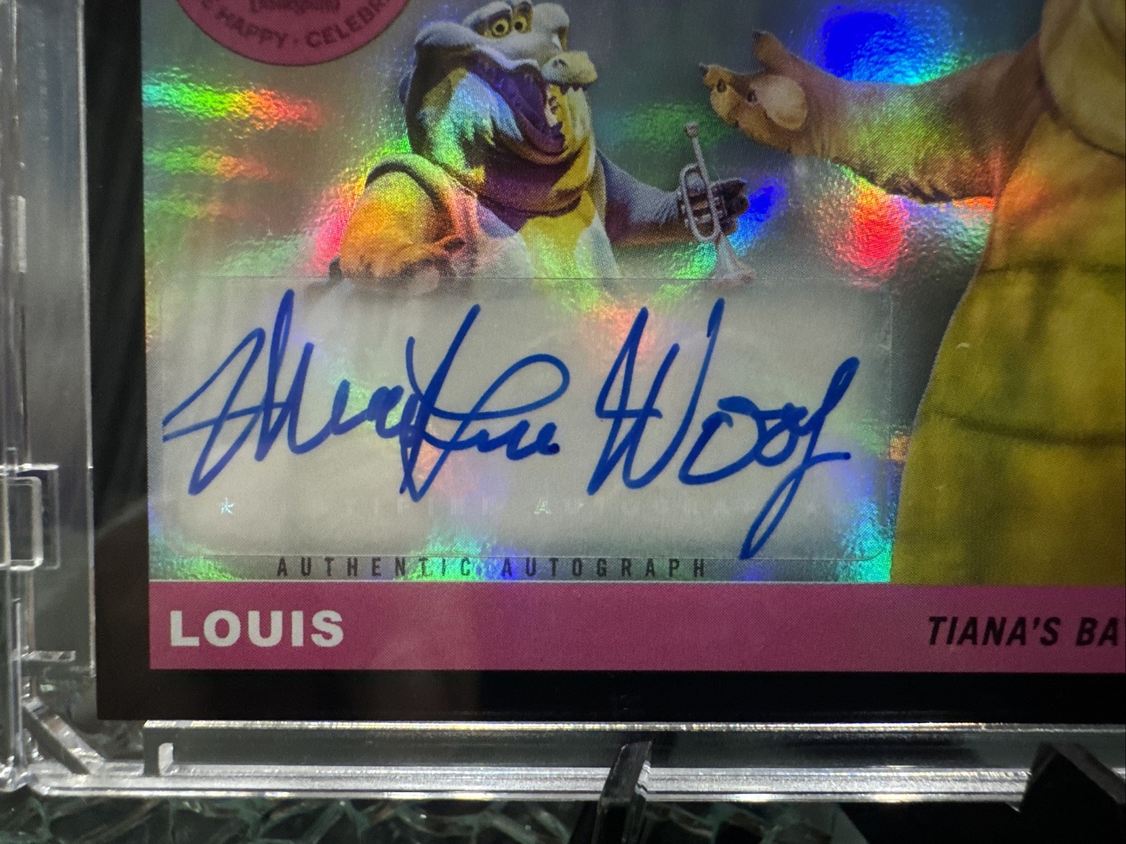 The Topps Disneyland 70th Anniversary LOUIS from TIANA AUTHENTIC AUTOGRAPH 07/10 trading card features an autograph from MICHAEL-LEON WOOLEY, the character LOUIS from Disney's Tiana franchise. This standard-sized card is made of card stock with a thickness of 35 Pt. It is an original, non-sport trading card manufactured by Topps in 2025, with an autograph authenticated by Topps. This limited edition card is serial numbered 07/10, making it a highly sought after collectible for fans of Disney and Tiana.